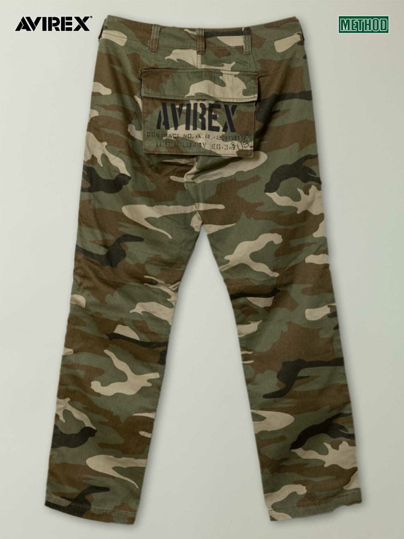 背面ポケットにはインパクトのある【AVIREX】ロゴをステンシルプリントで配置。