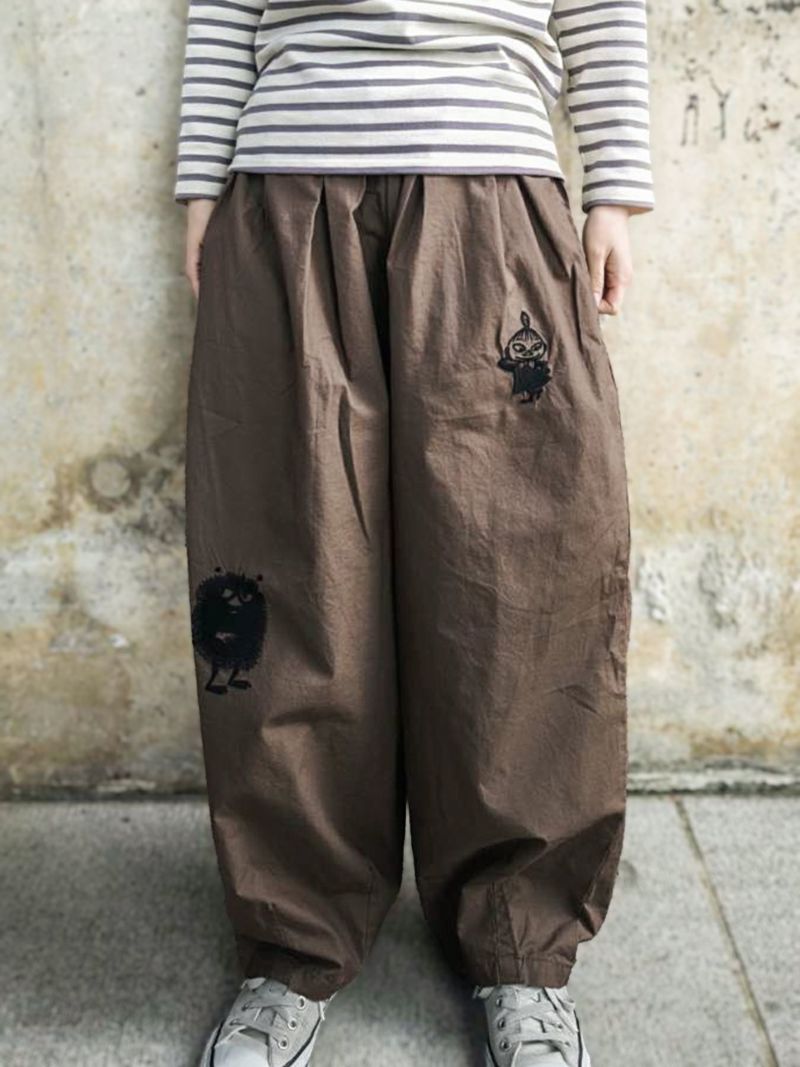 今年もトレンドのバルーンシルエットパンツにムーミン村の仲間たちの刺繍を施したデザイン。