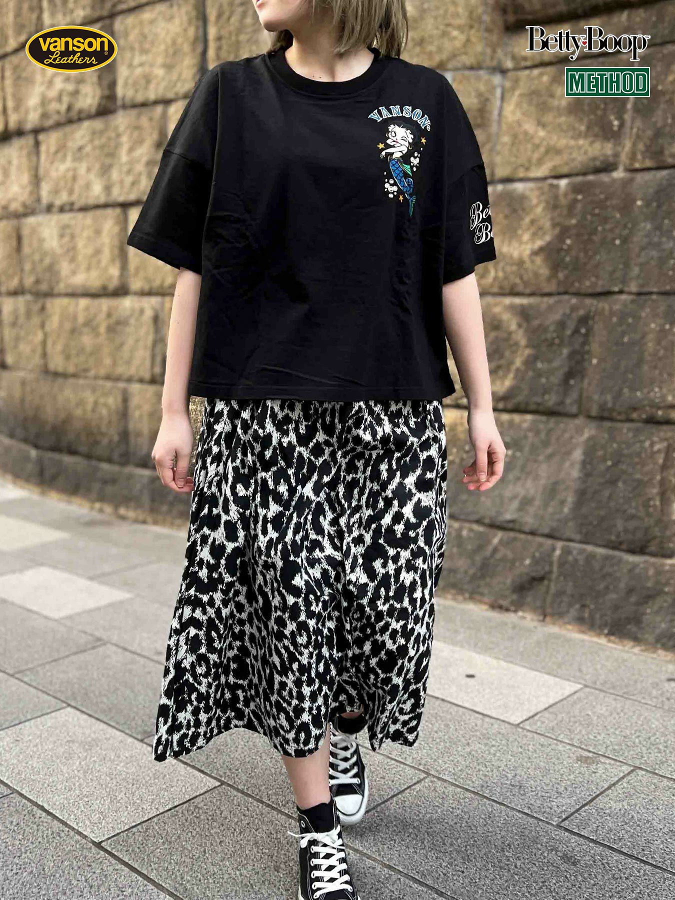 - ≪50%OFF≫【VANSON×BETTYBOOP】“マーメイドベティ”刺繍入りフェイクレイヤード半袖ワンピース〔別注〕≪返品・取寄対応不可≫