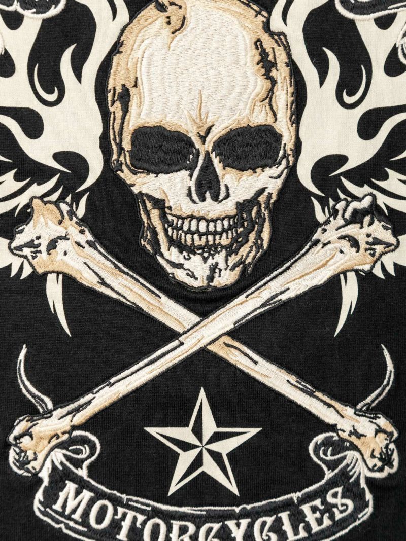 背面に大きく描かれたクロスボーンスカルは、ウィングに見立ててファイヤーパターンをあしらい、バイカーテイスト全開で表現しました。