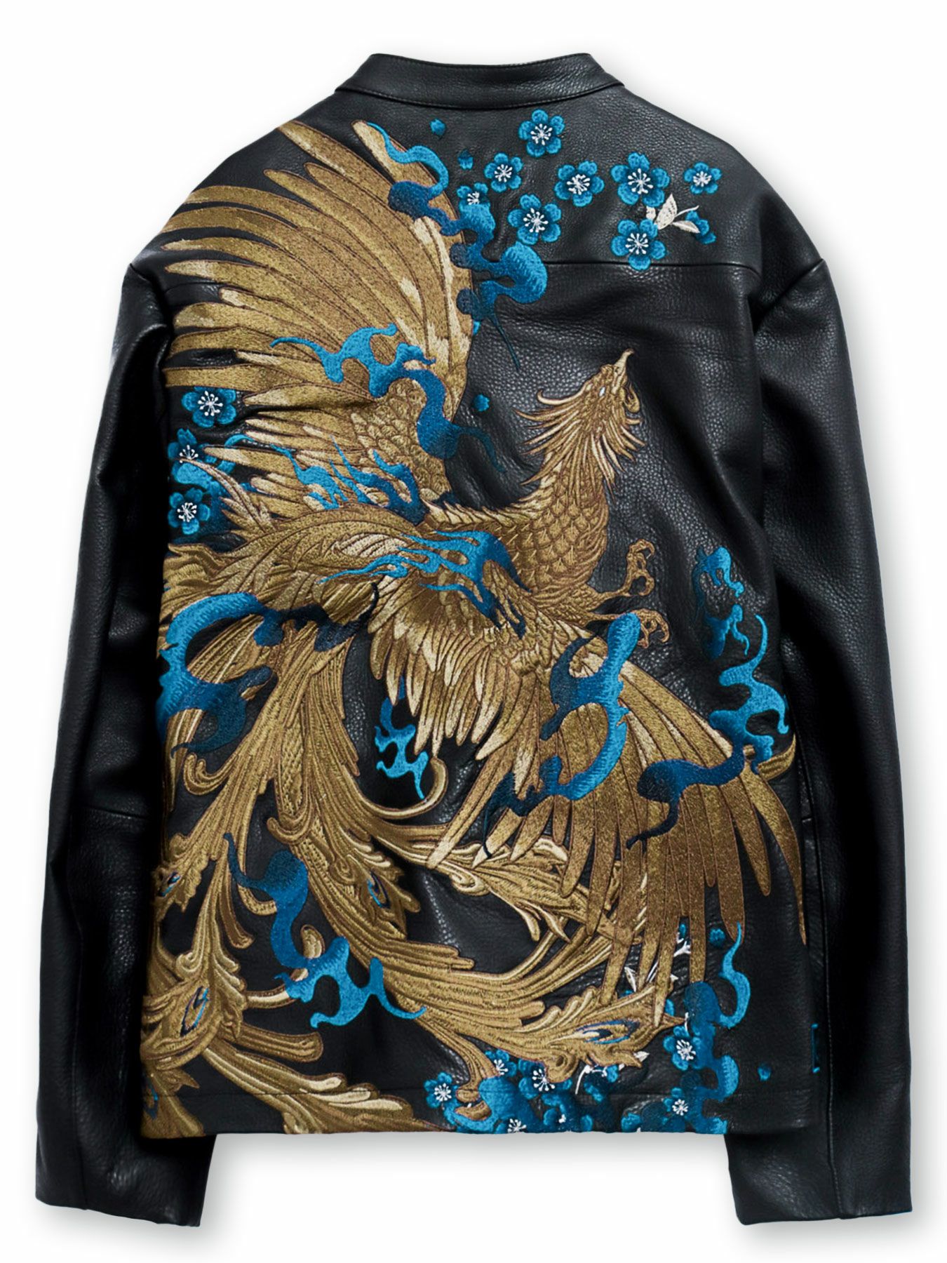 袖やポケットのパイピングに使用された蒼いレザーに合わせた蒼炎の刺繍を綺麗なグラデーションで魅せ、鳳凰の刺繍を彩った至極、頂の1着です。