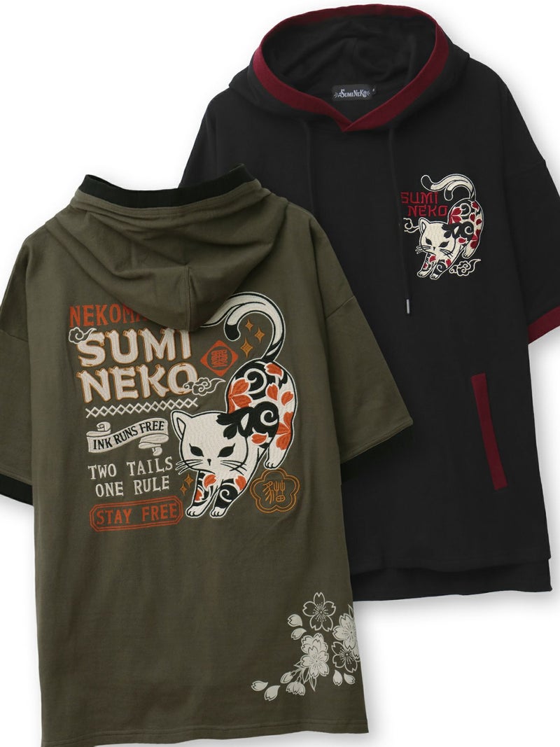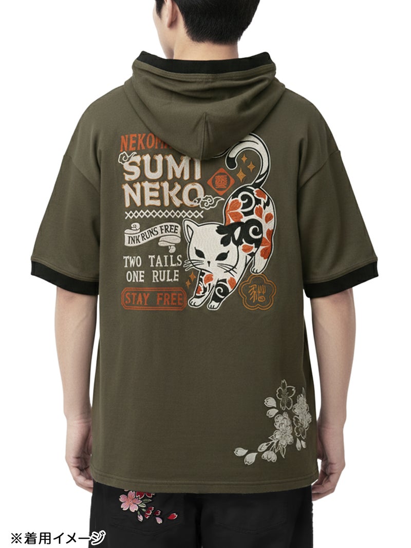- <春の予約会>【SUMINEKO】“伸び猫”刺繍入りBIGシルエット半袖プルパーカー