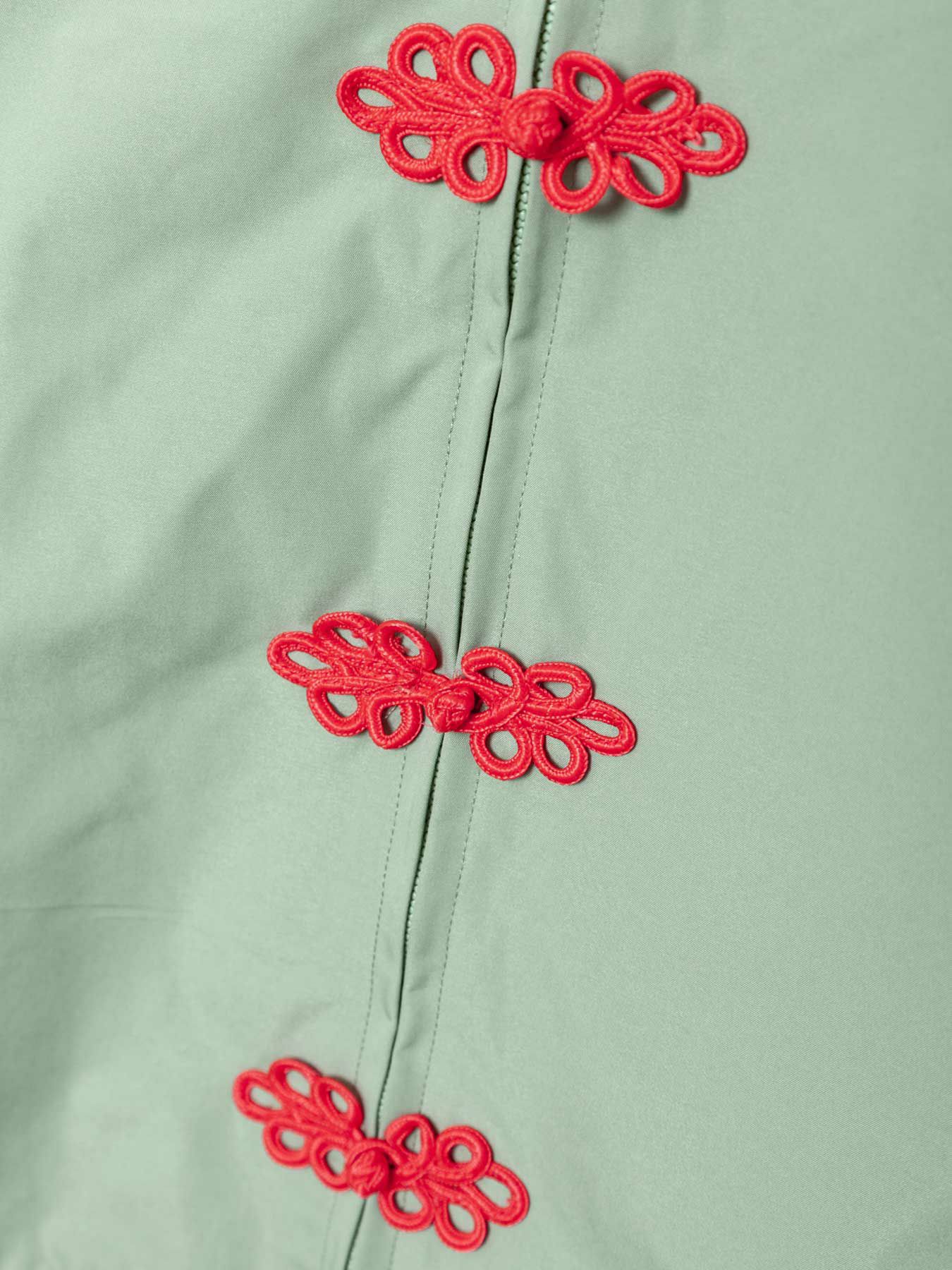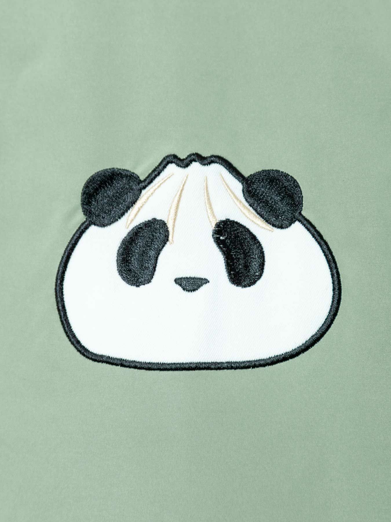 フロントにはチャイナボタンを付属。左右の胸には中華饅頭のような、ぷっくりとしたパンダフェイスをアップリケ刺繍で施しました。