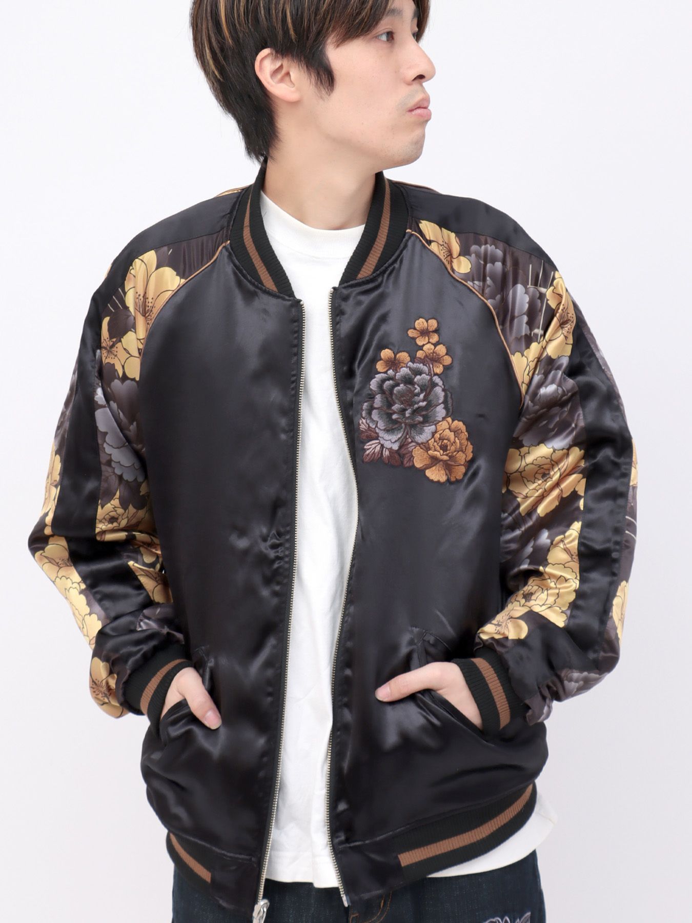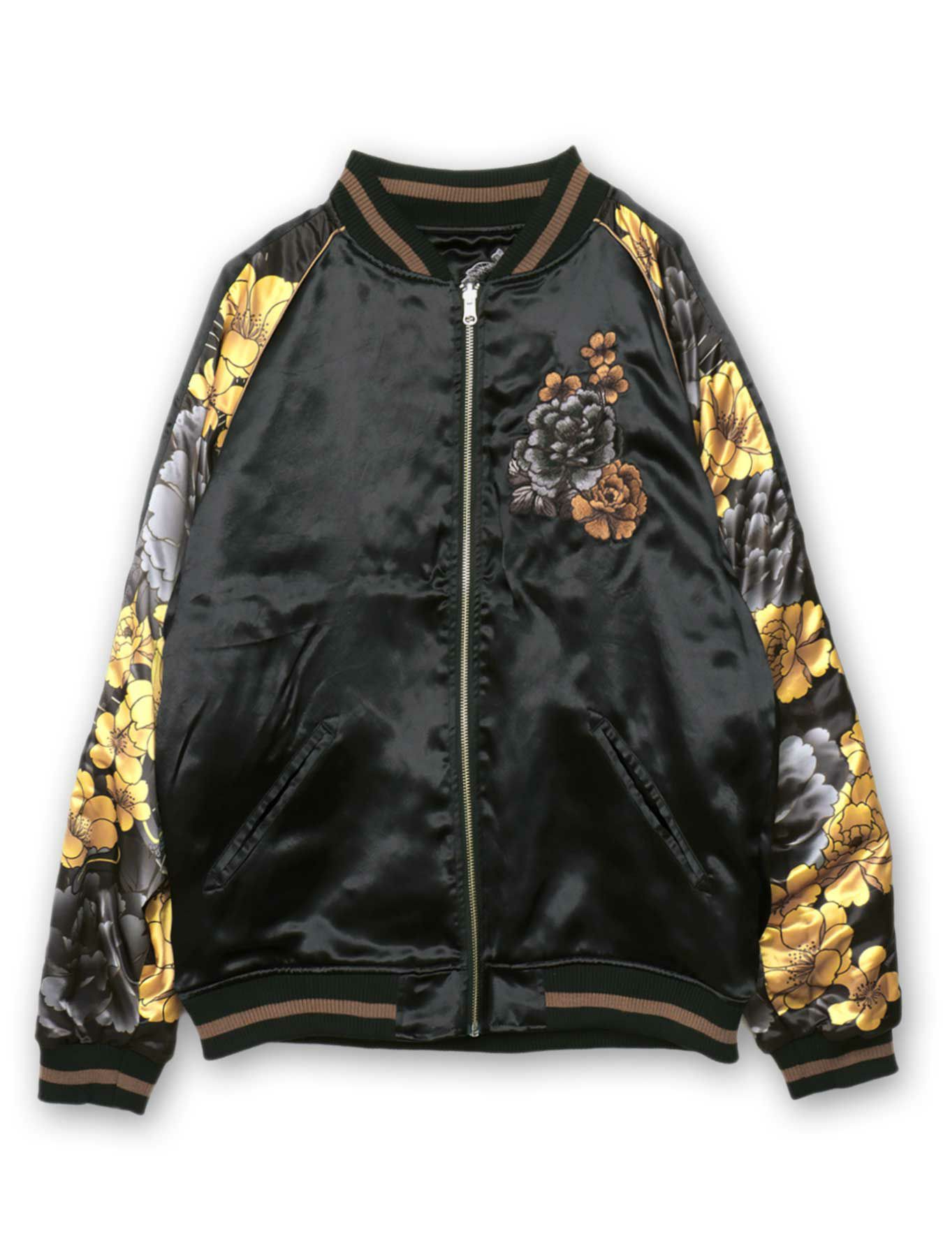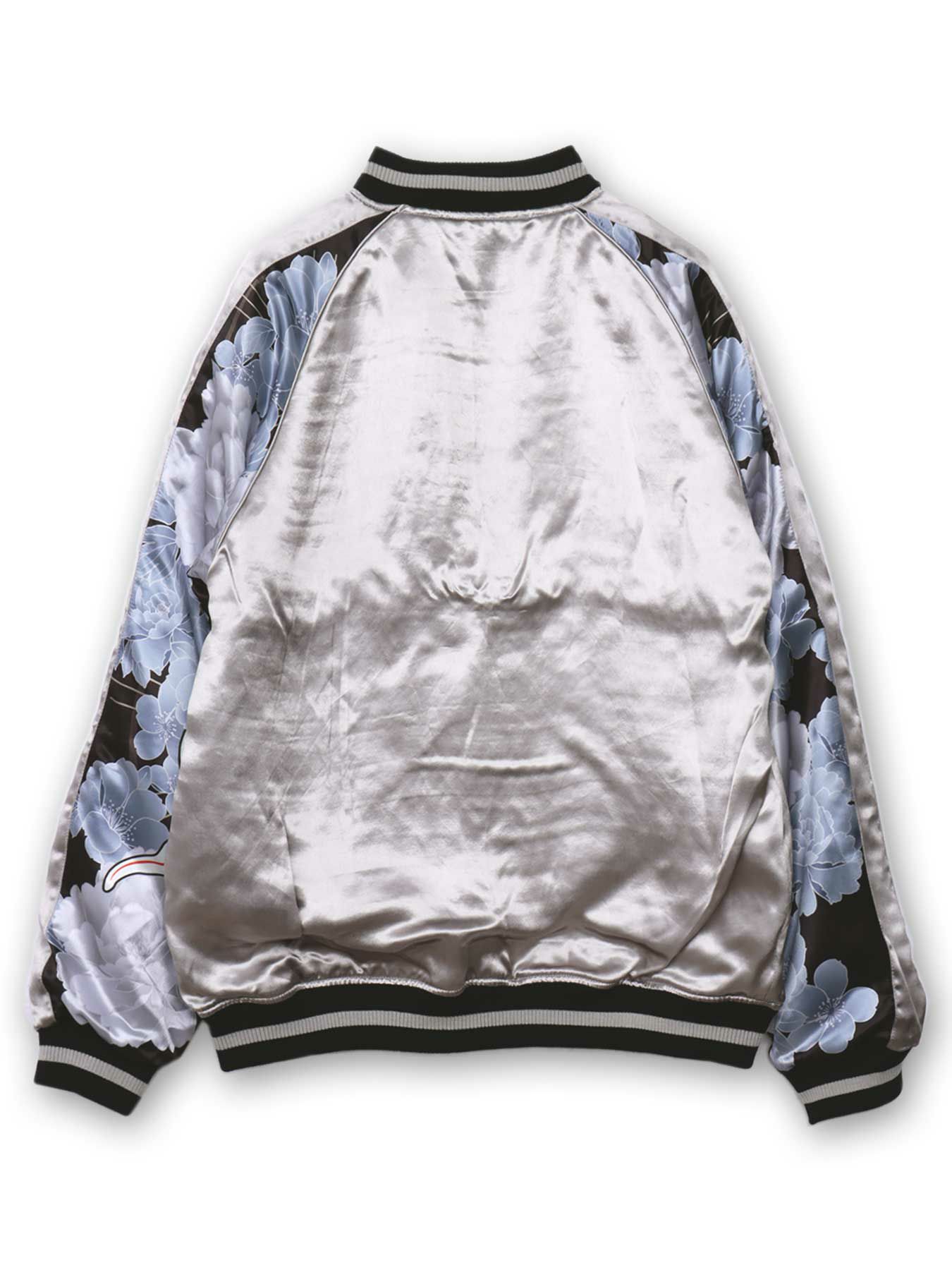 またリバーシブル仕様の裏面には胸元に牡丹の刺繍、両袖には昇華転写プリントで表現された煌びやかな牡丹を総柄でデザイン。