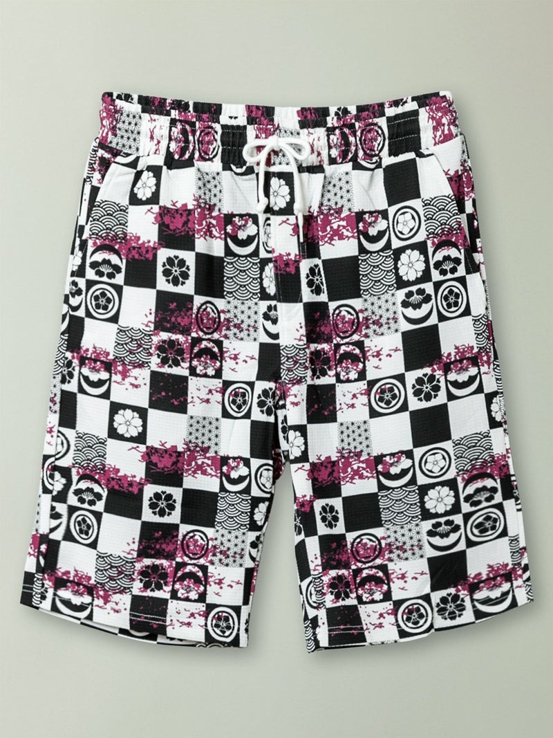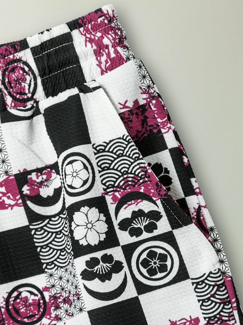 - 【新主己】“市松模様×家紋”総柄プリント ワッフル素材ショーツ≪返品・取寄対応不可≫