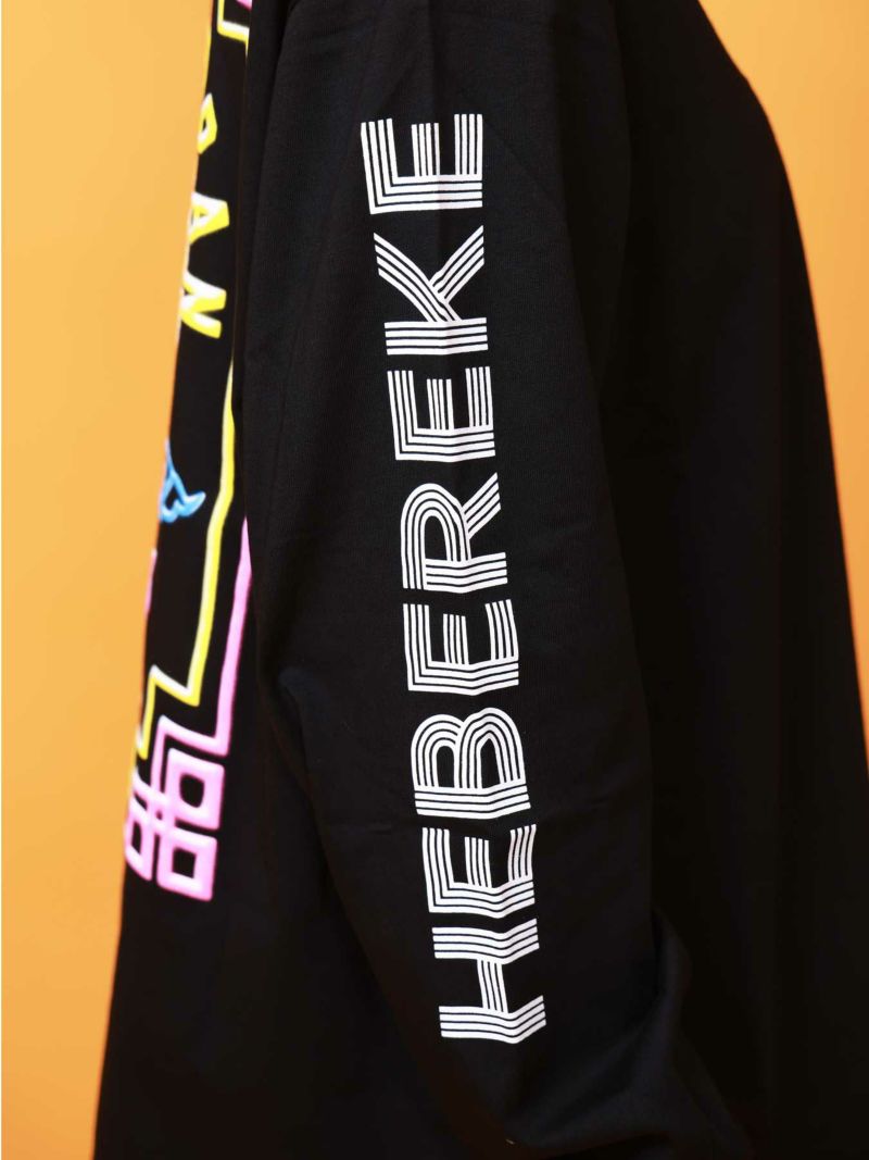 フロントのYOIDOREロゴはカラフルな刺繍でさりげなく主張。袖に入ったHEBEREKEロゴプリントはロンTに必須のポイントです。