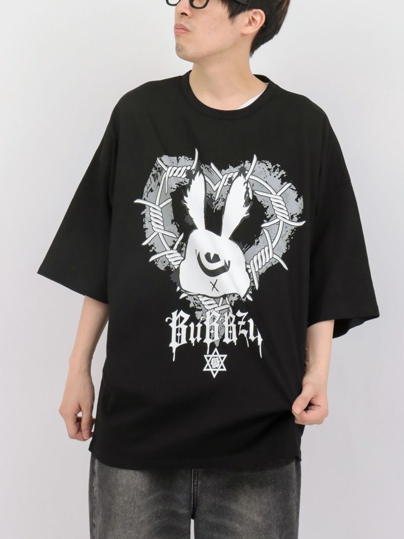 半袖Tシャツ前面には、【PSYCHO NATION】お馴染みのモチーフ、有刺鉄線のハートで装飾された【BuBBzu】のメインキャラクター「FUKIGEN」を組み合わせて配置。