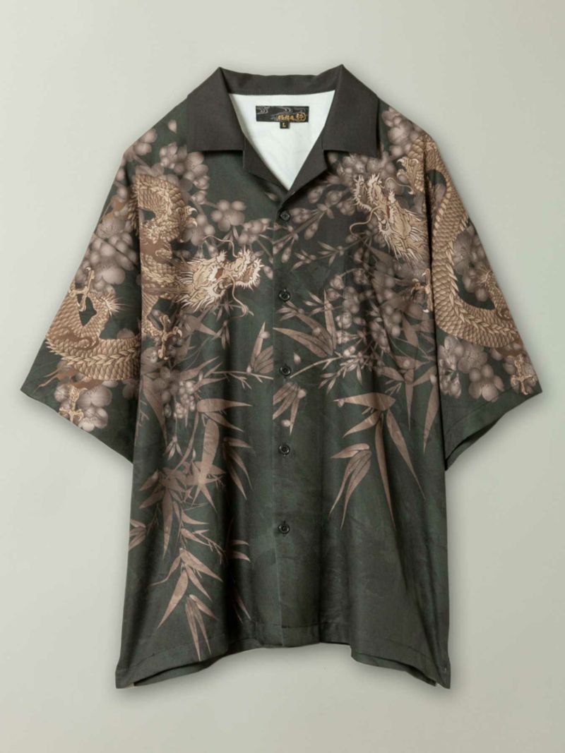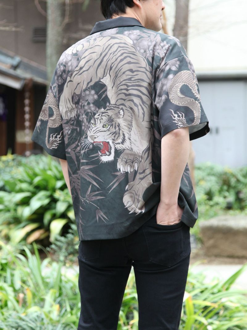 - ≪20%OFF≫【絡繰魂・粋】“黒檀 龍虎”鬼ちりめん生地アロハシャツ≪返品・取寄対応不可≫