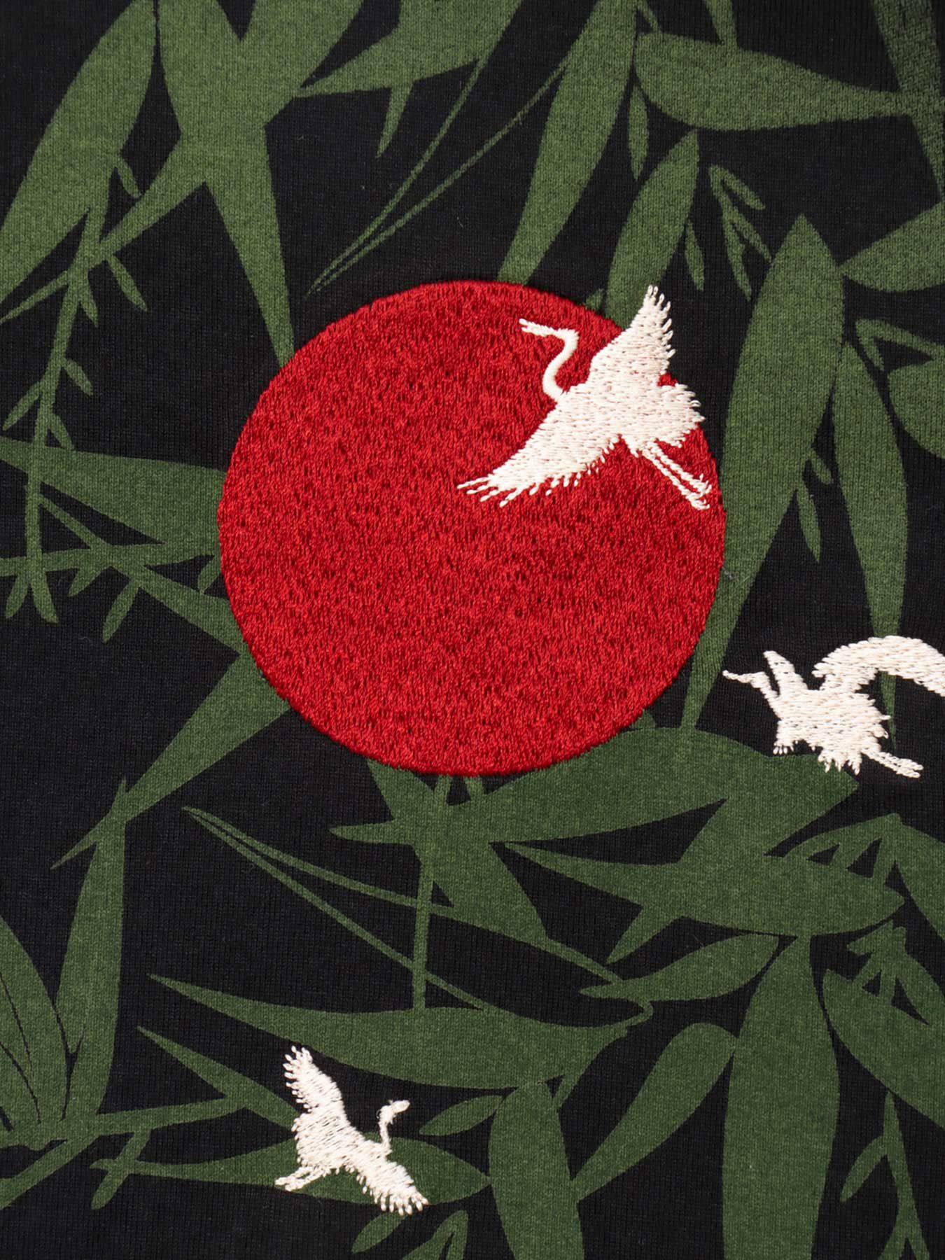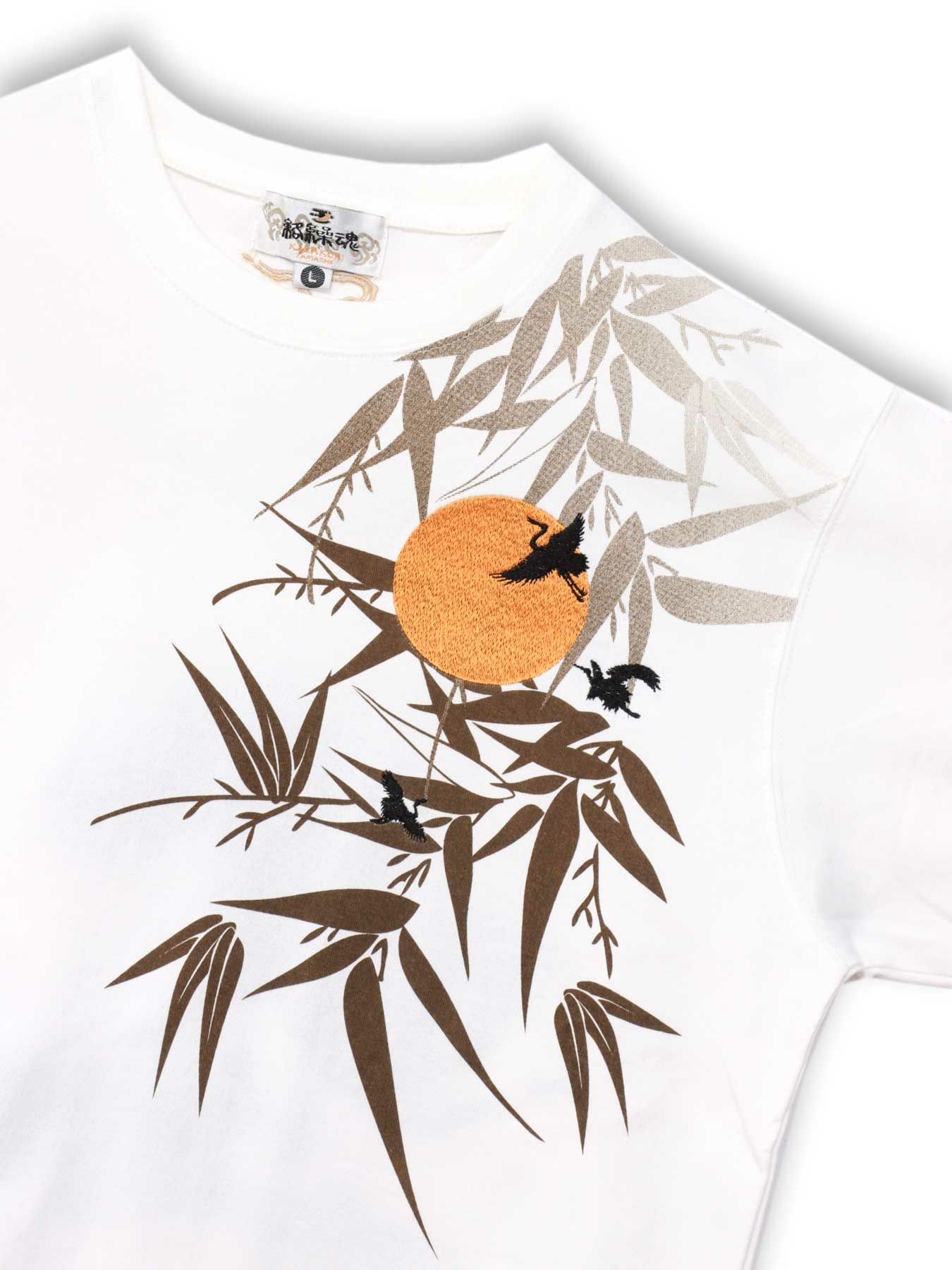 背景に描かれた太陽と空を飛びまわる鶴は、前面の左肩口から胸元にかけて描かれており、それぞれの本体色によって色味にも変化を持たせ異なる表情に仕上げました。