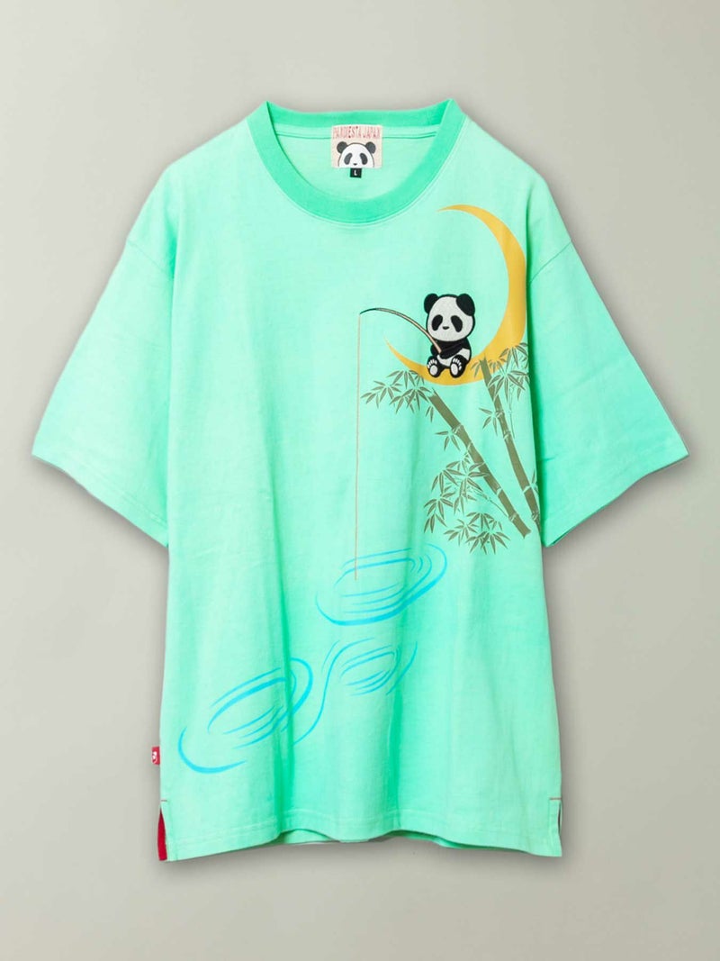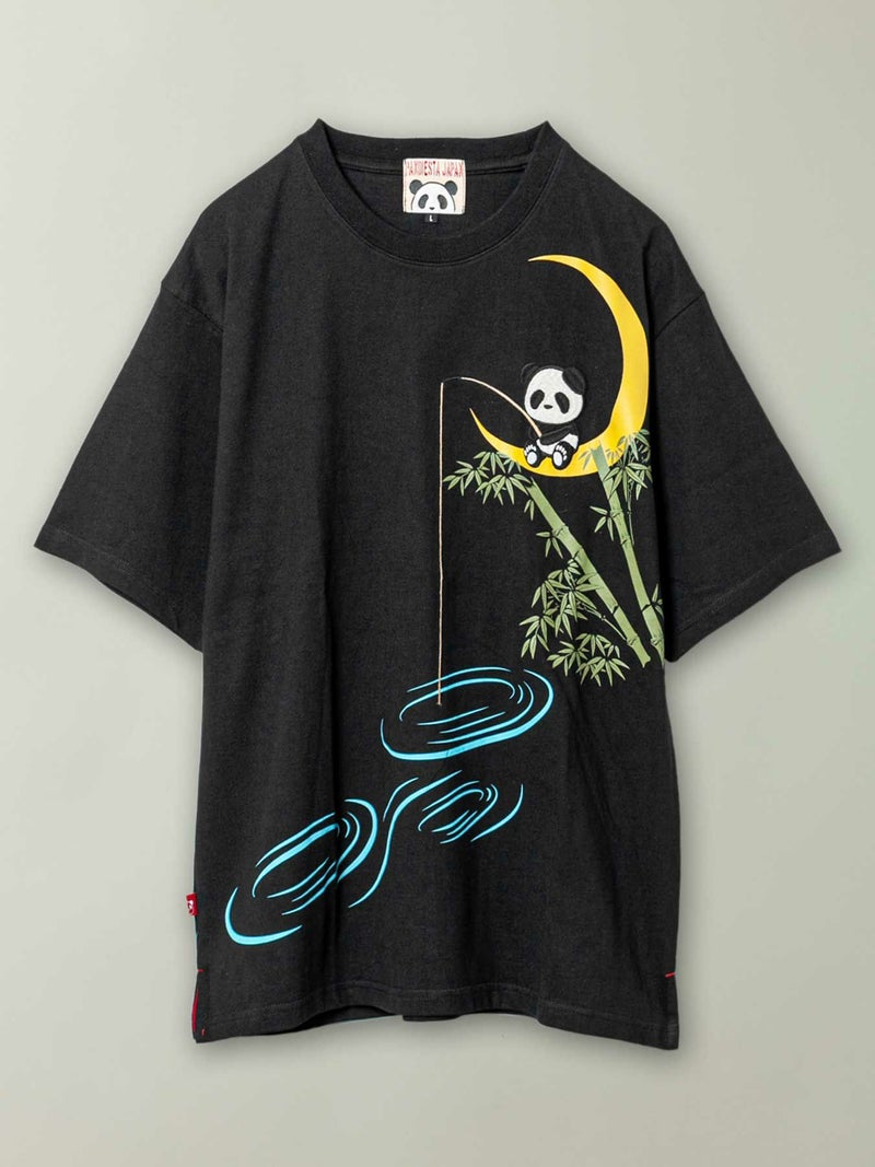 こちらは、月や葉っぱに腰掛けて夜釣りを楽しむパンダを描いた和風グラフィックTシャツ。