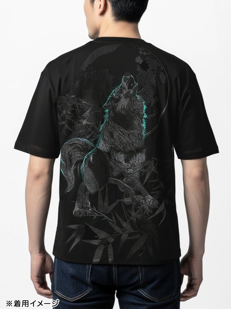 闇夜に潜む“漆黒の狼”をメインモチーフに据えた、総刺繍仕立ての半袖Tシャツ。