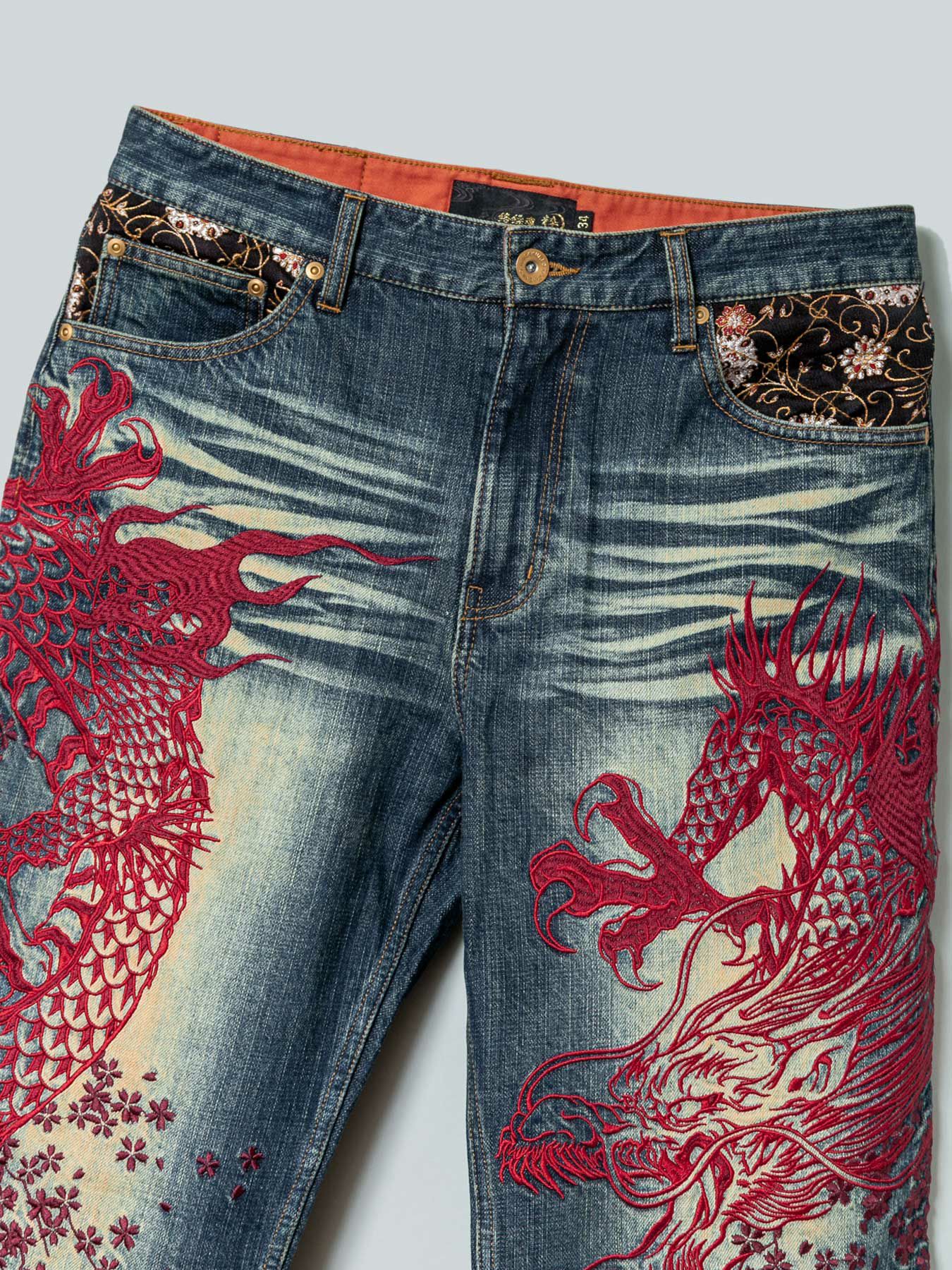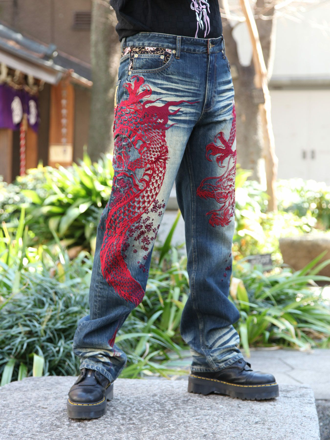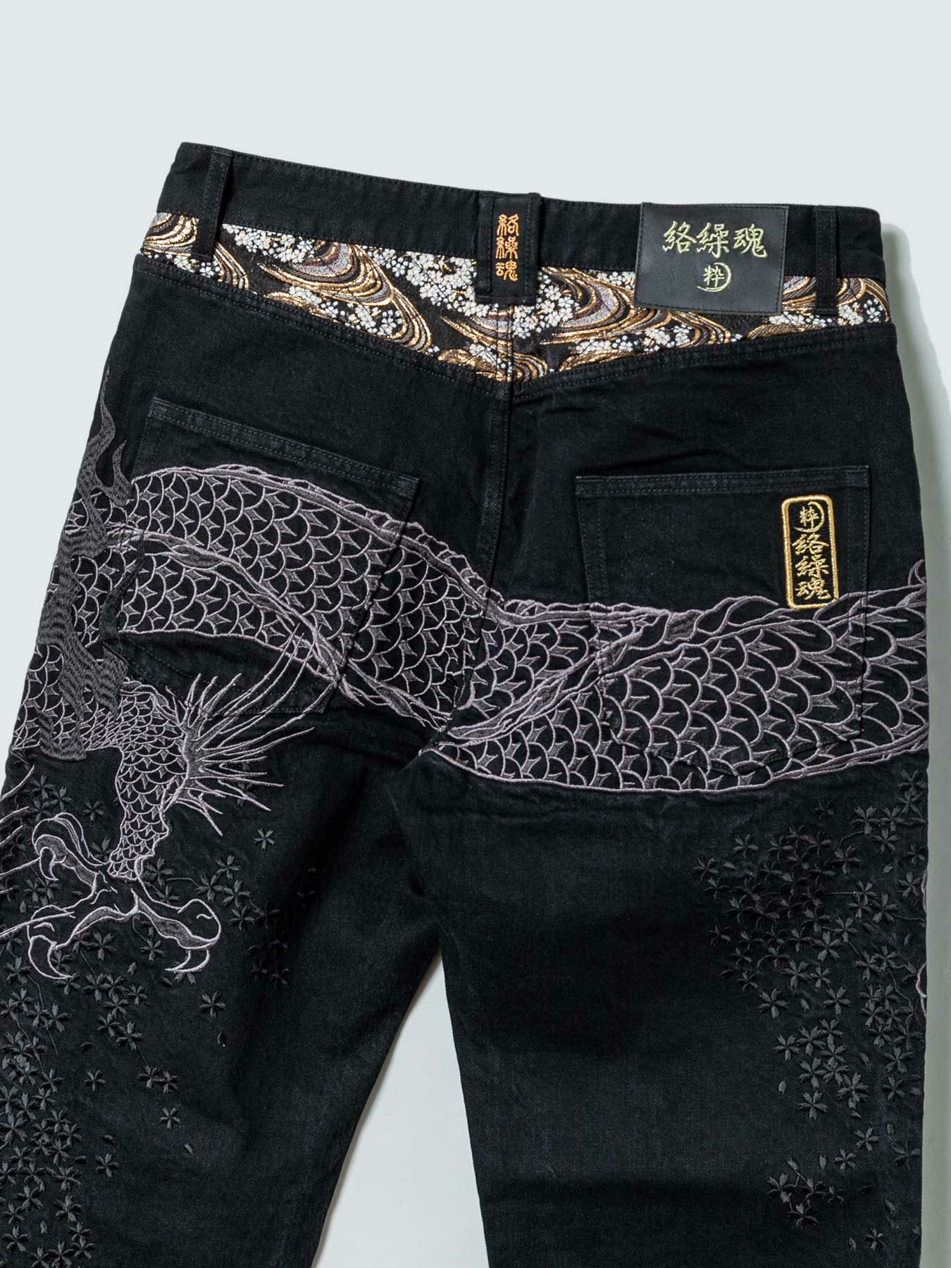 - 【絡繰魂・粋】“巻龍”総刺繍 金襴切替デニムパンツ〔別注〕