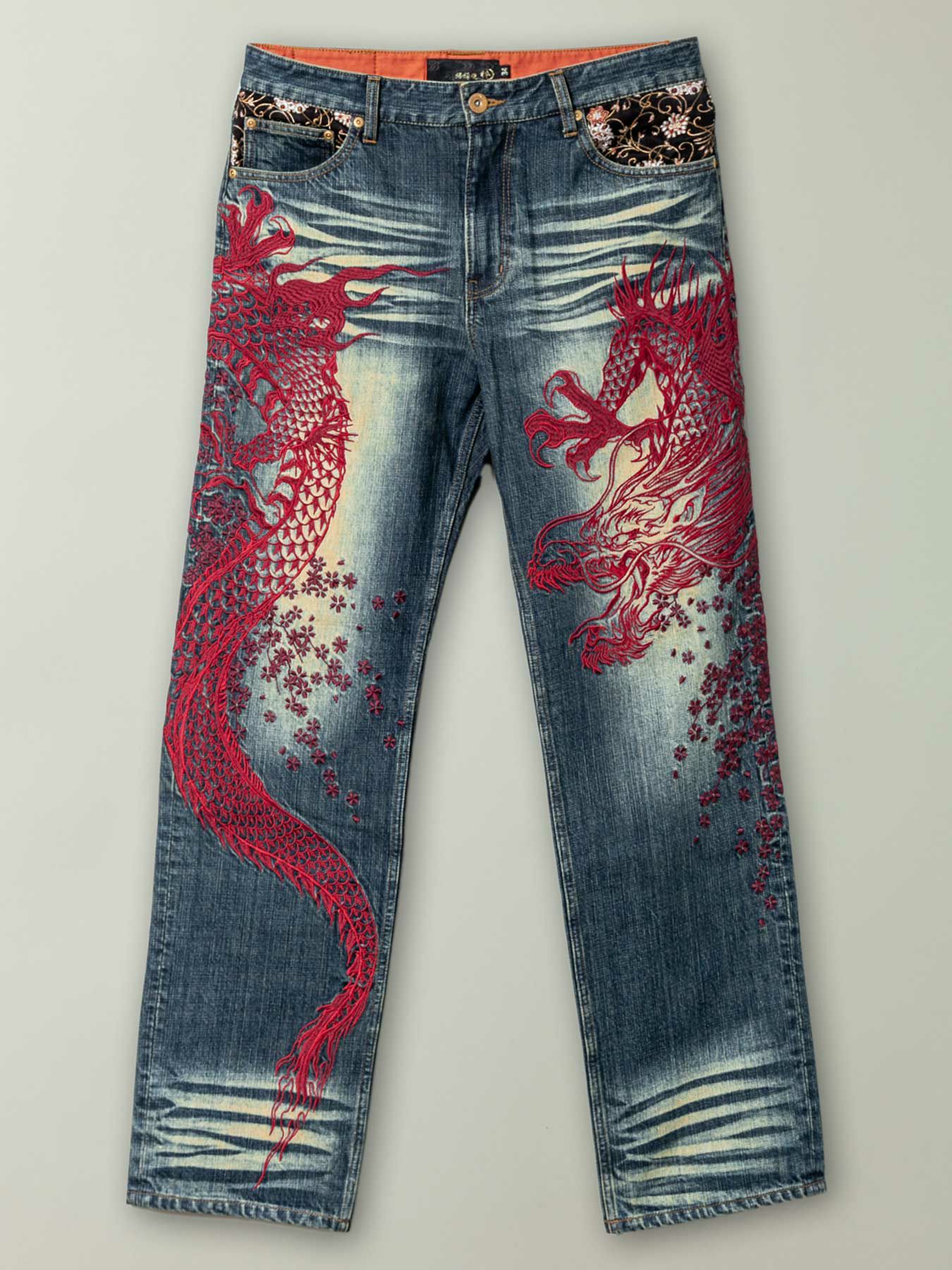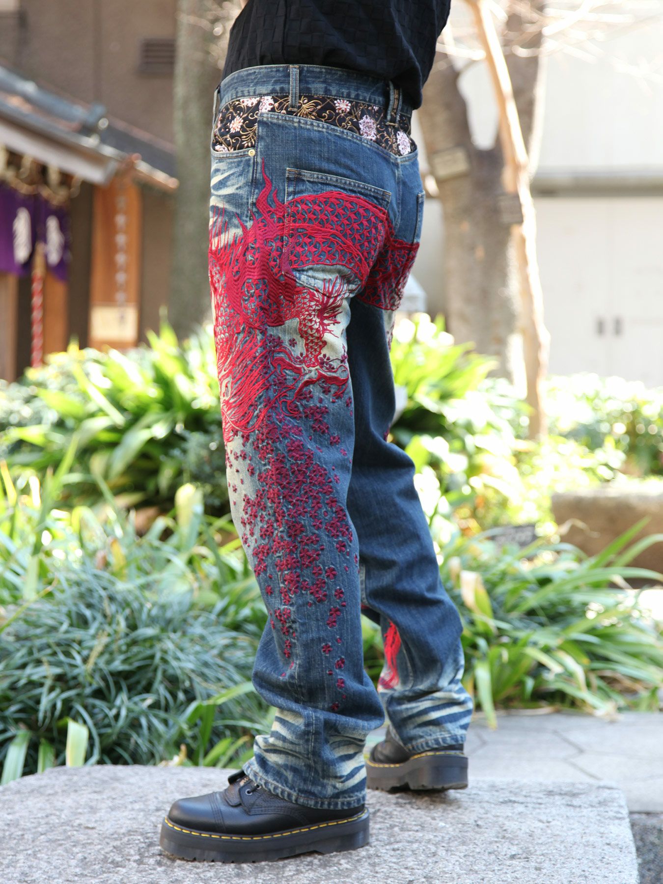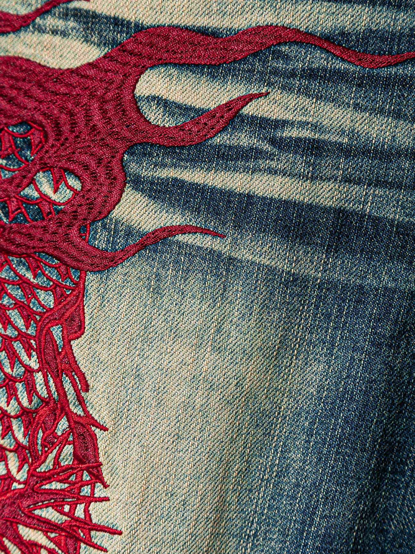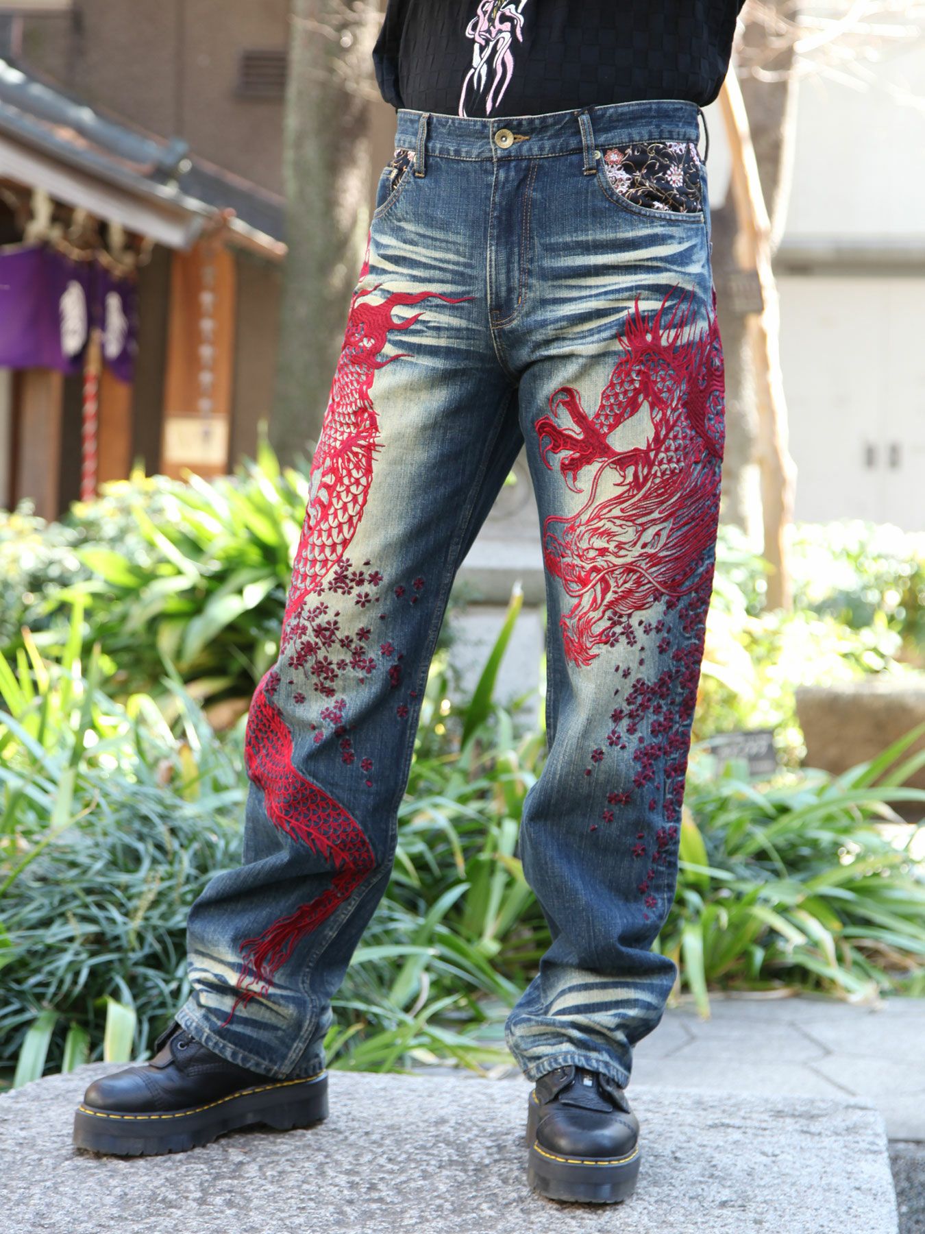 - 【絡繰魂・粋】“巻龍”総刺繍 金襴切替デニムパンツ〔別注〕