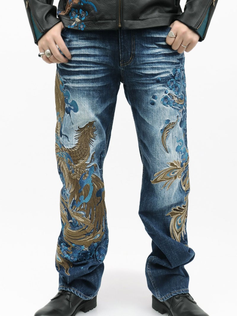 【絡繰魂・頂】“蒼炎”鳳凰総刺繍デニムパンツ〔別注〕