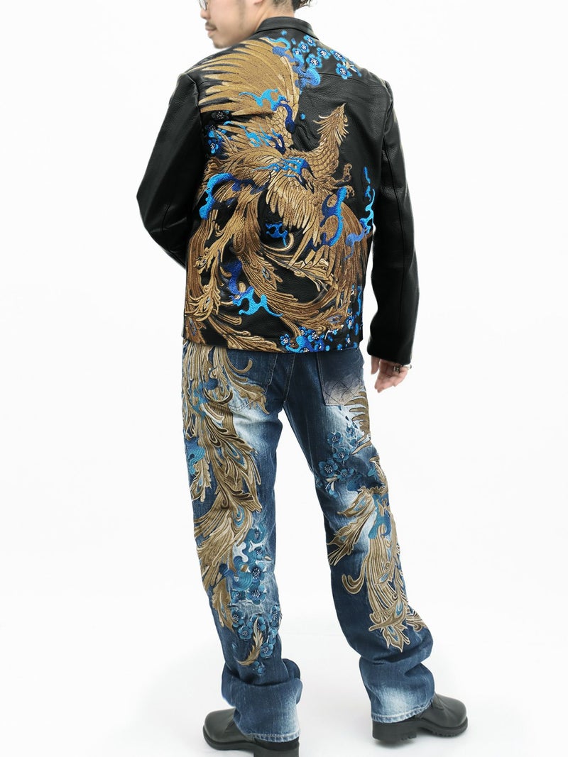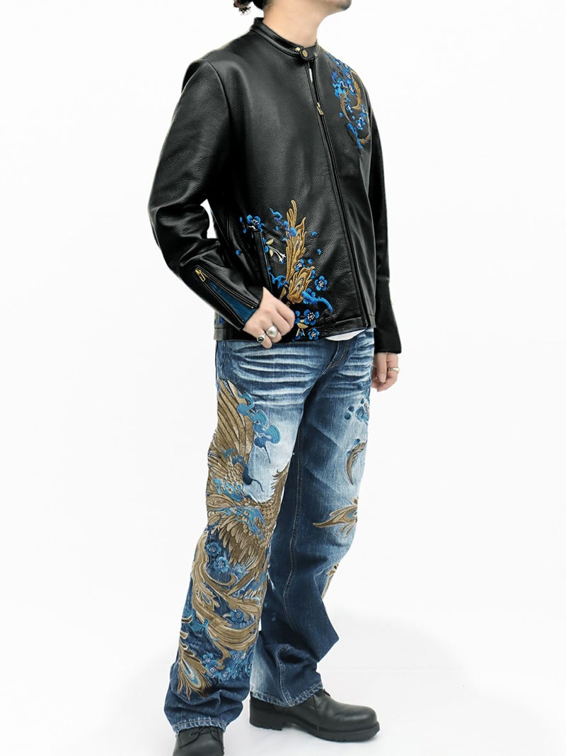 レザージャケットに繋がるように計算された羽の刺繍と、後ろから前に大きく刺繍で施された鳳凰が存在感バツグンの1本。