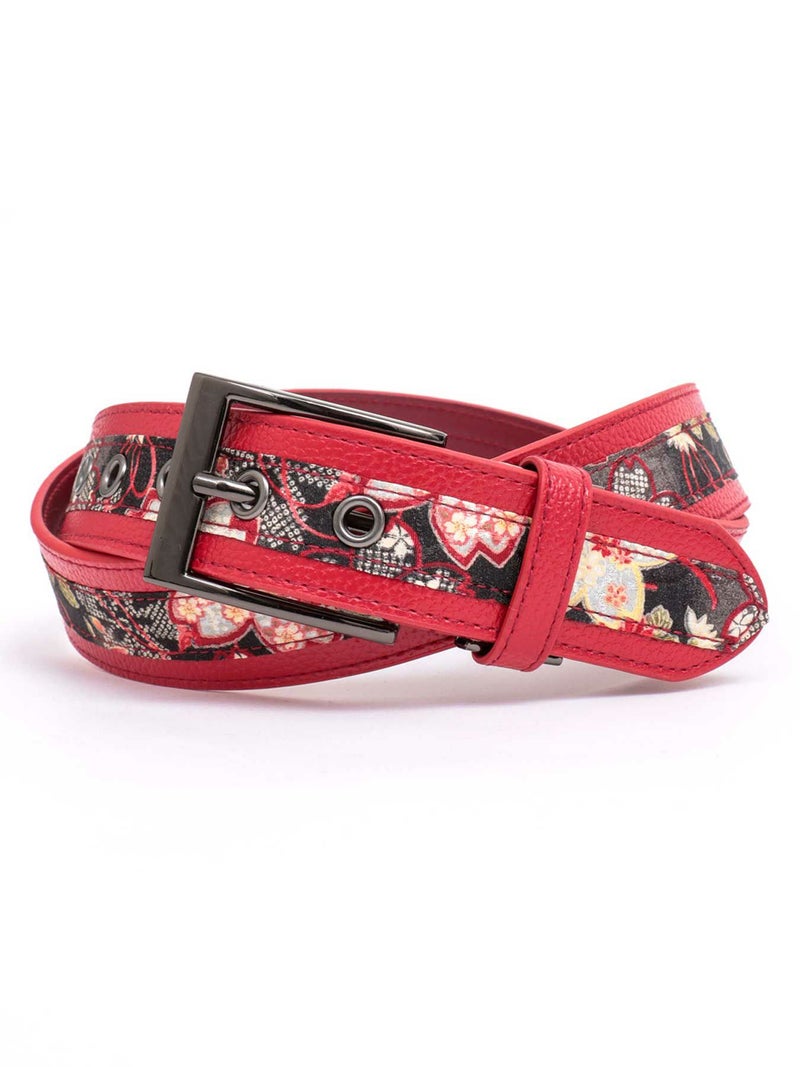 フェイクレザーとちりめん生地の切り替えデザインが魅力のベルト。