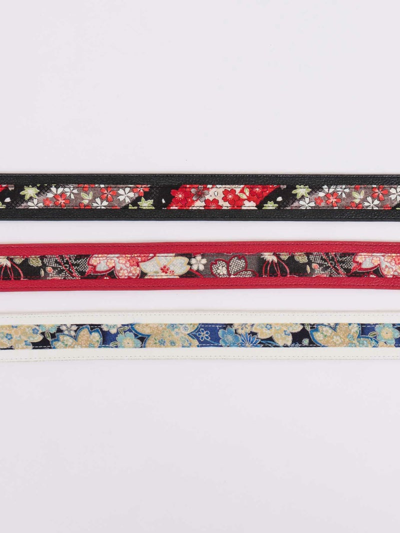 本体生地の色に合わせて、中央に配したちりめん生地の柄を変えたこだわり仕様。ブラックのバックルが洗練された大人の雰囲気を演出します。