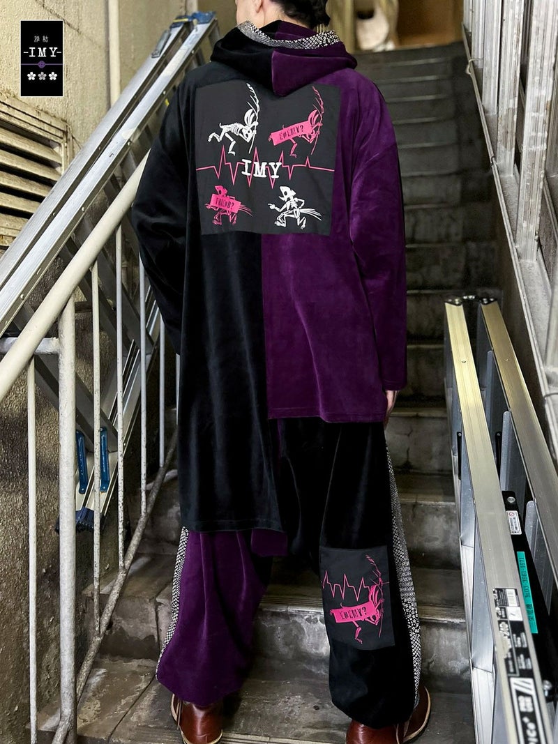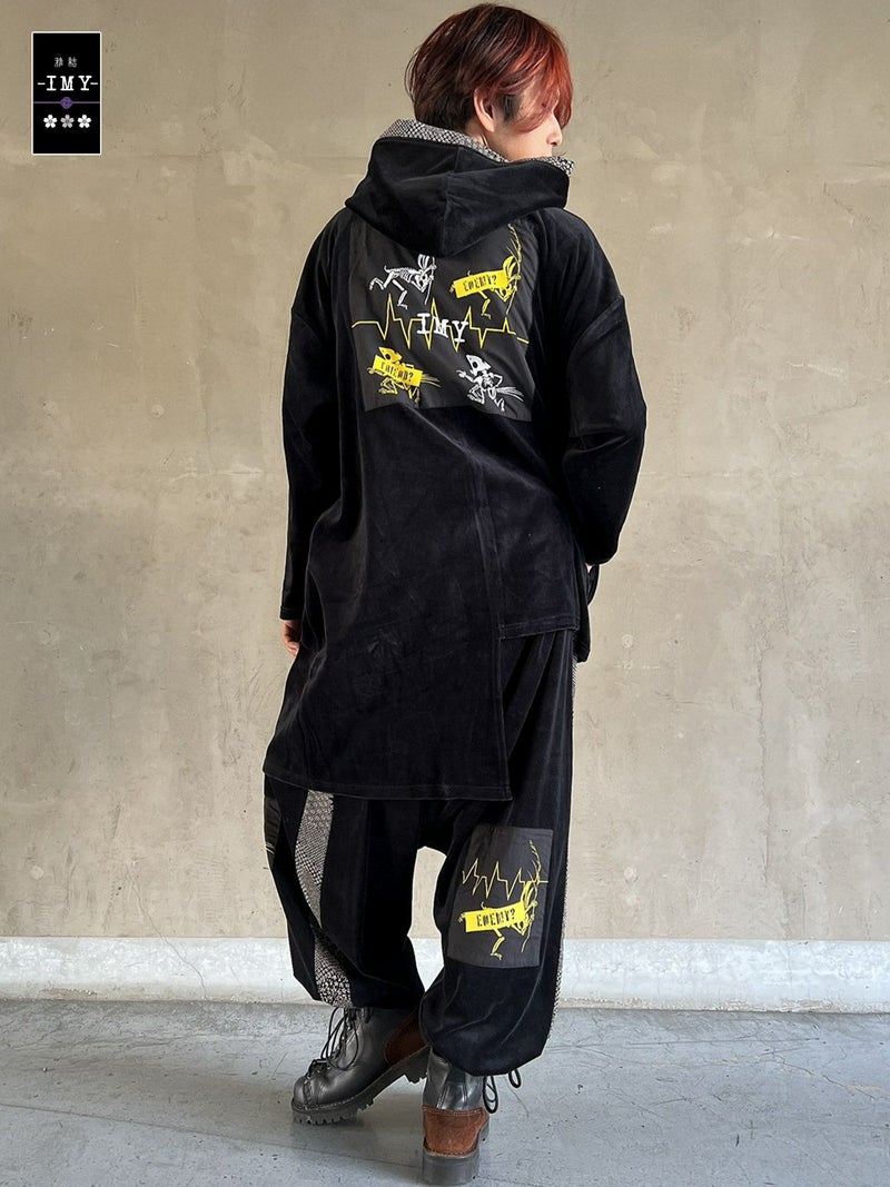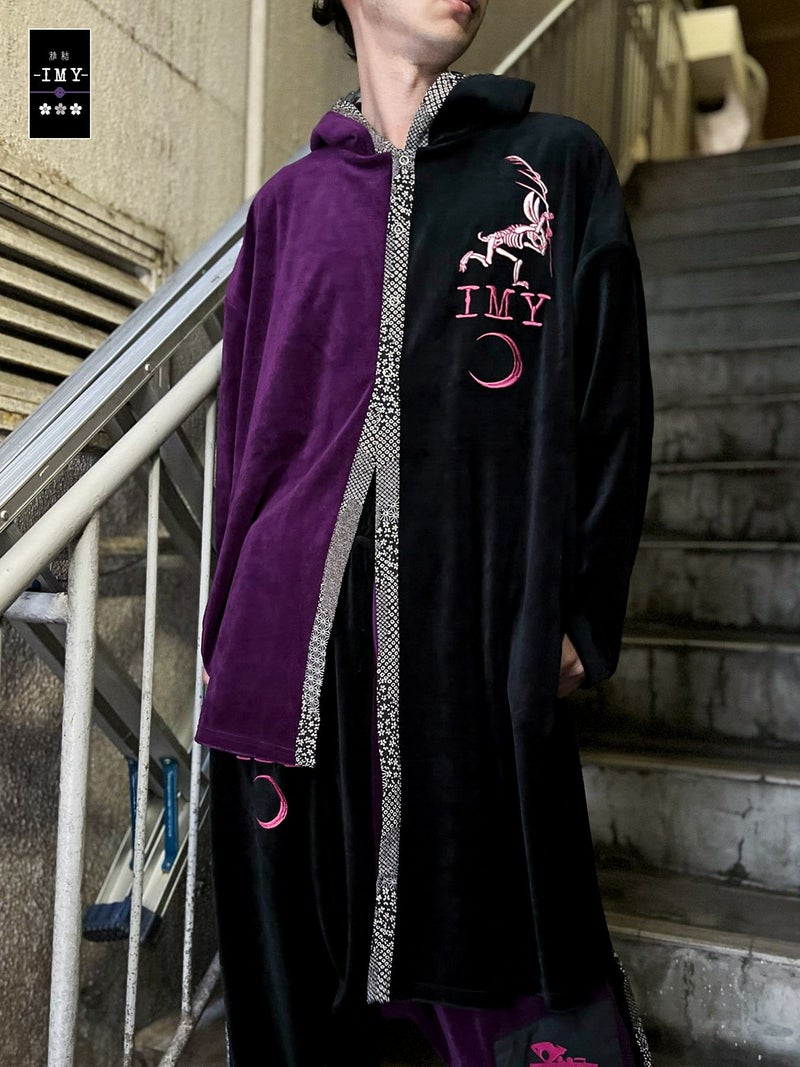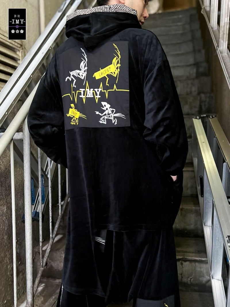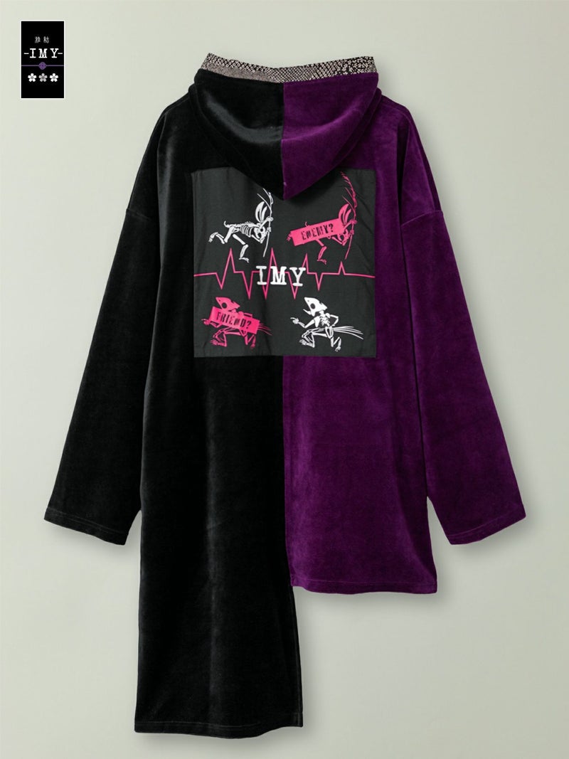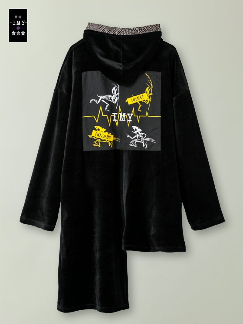 5. ≪30%OFF≫【雅結-IMY-】“レントゲン鳥獣戯画”アシンメトリー切替ベロア素材ロングボタンパーカー≪返品・取寄対応不可≫
