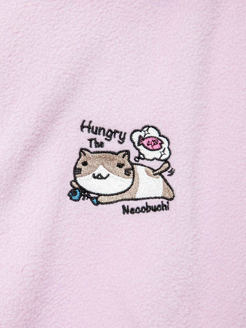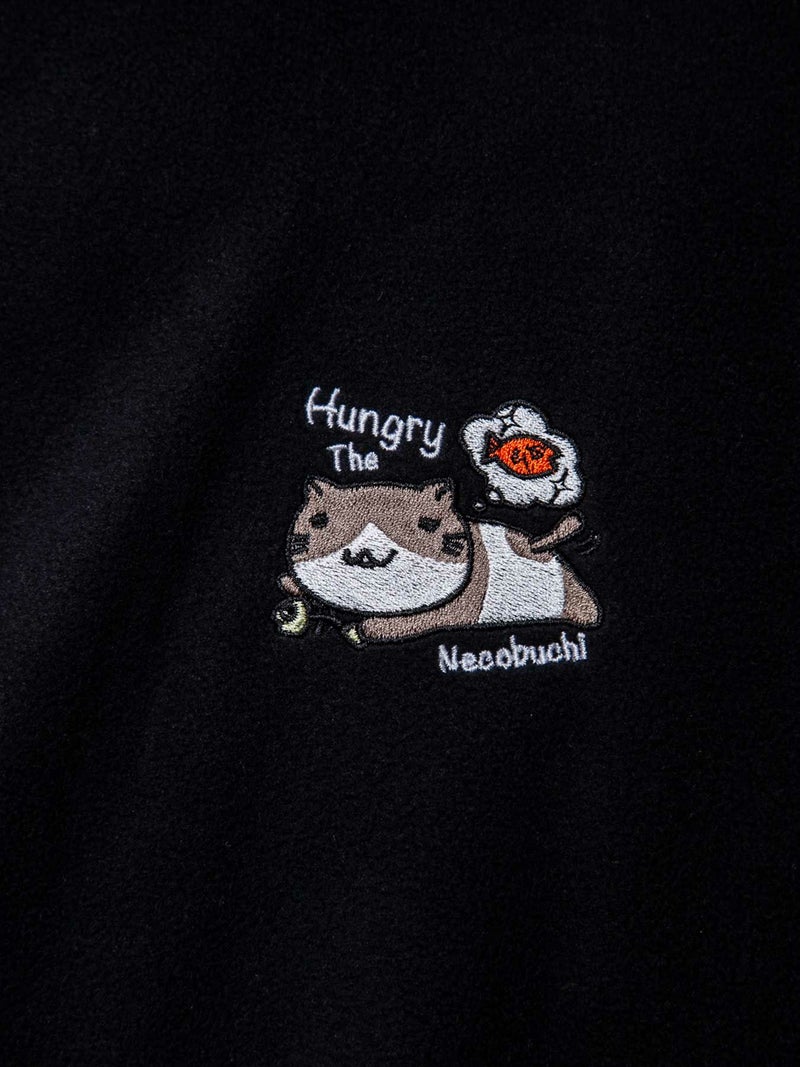 「Hungry...」と、好物のおサカニャを思い浮かべゴロゴロする猫渕さんの姿を、胸元にワンポイント刺繍で施しました。