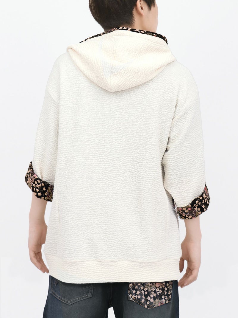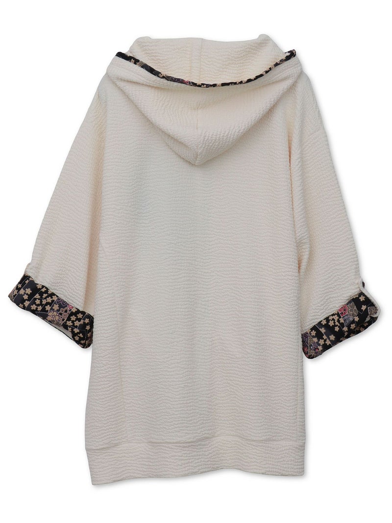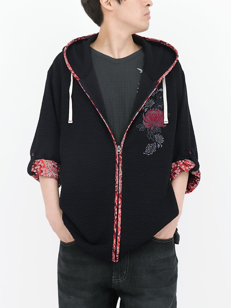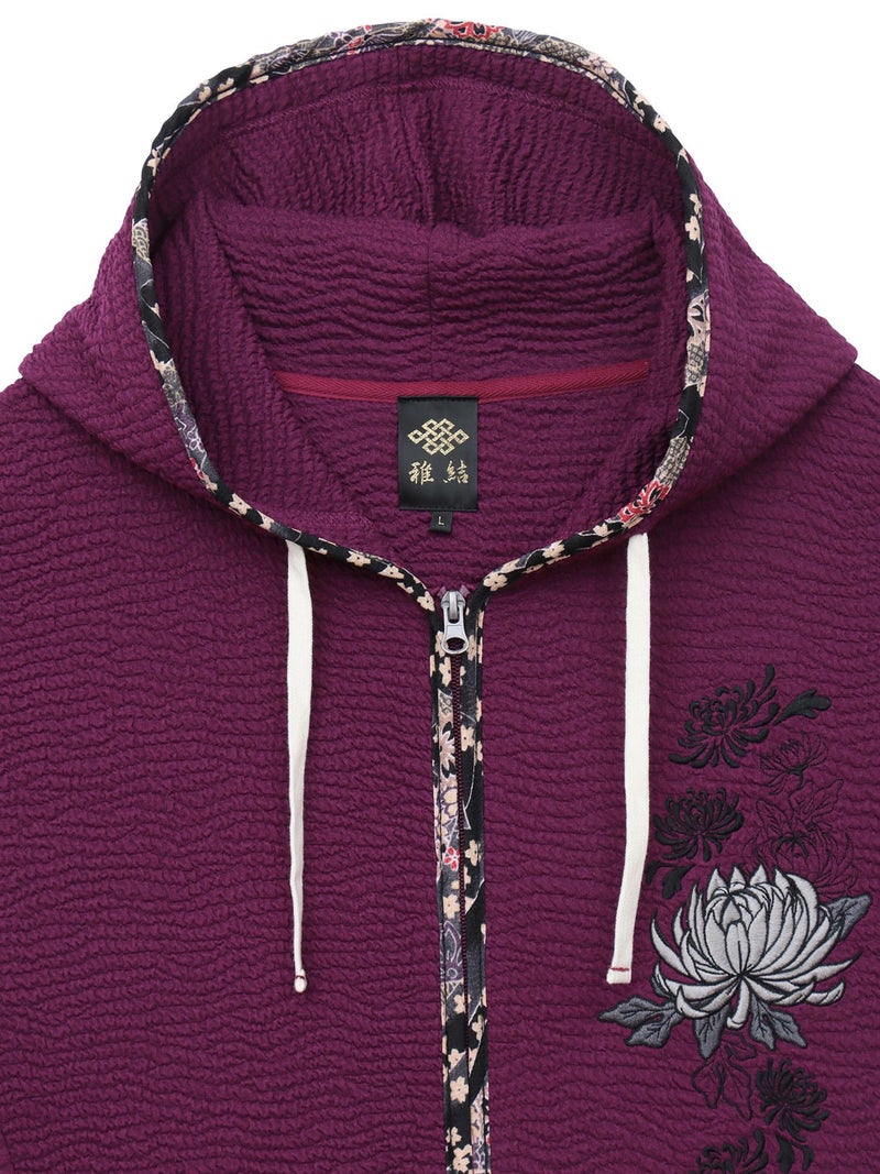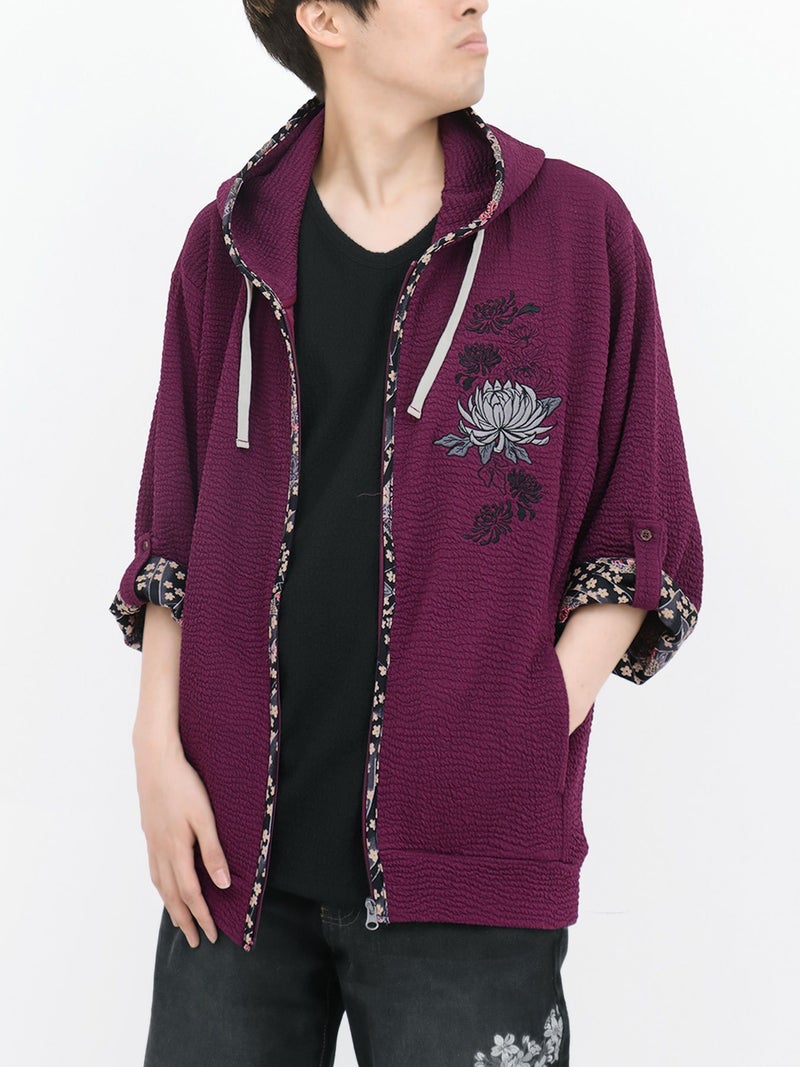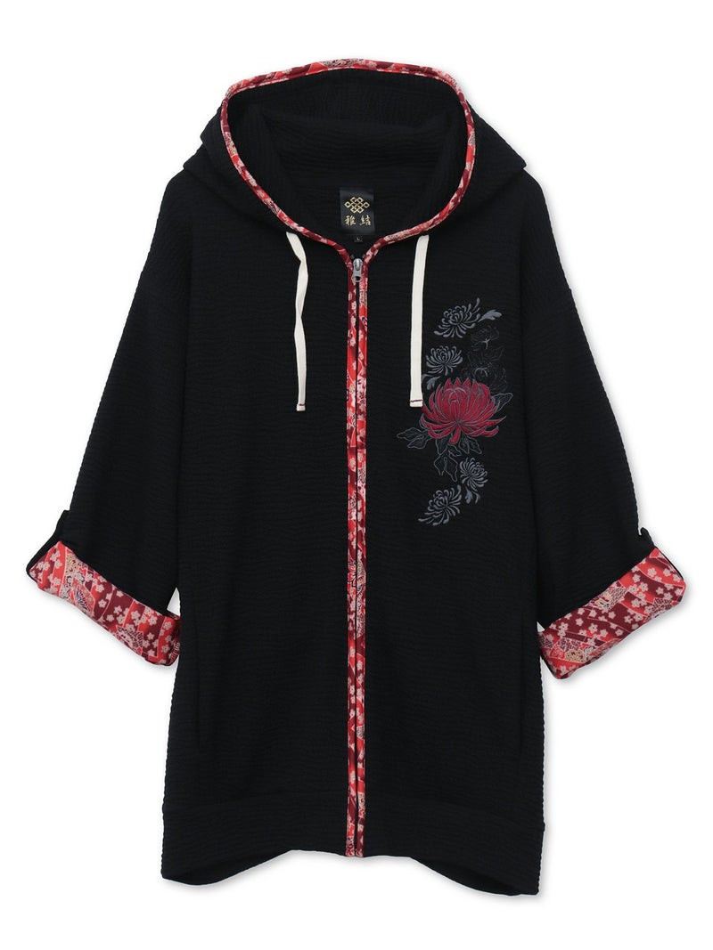 - ≪22%OFF≫【雅結】菊刺繍ふくれジャガード素材 和生地遣い7分袖ZIPパーカー≪返品・取寄対応不可≫