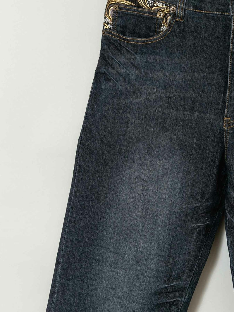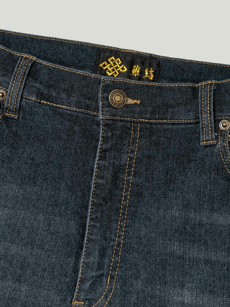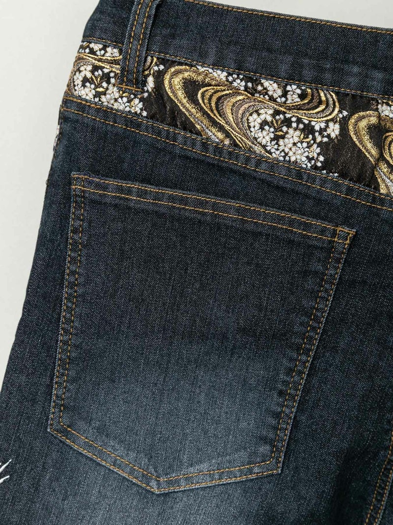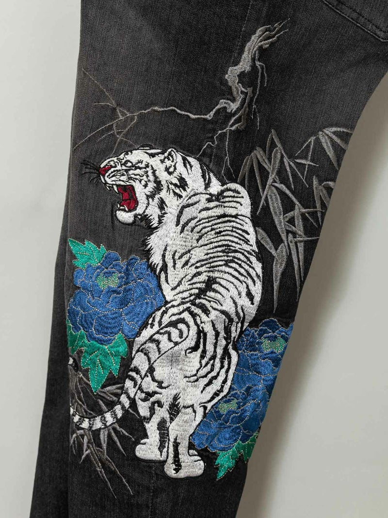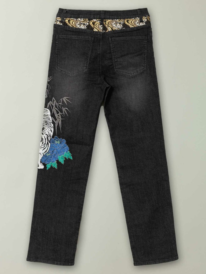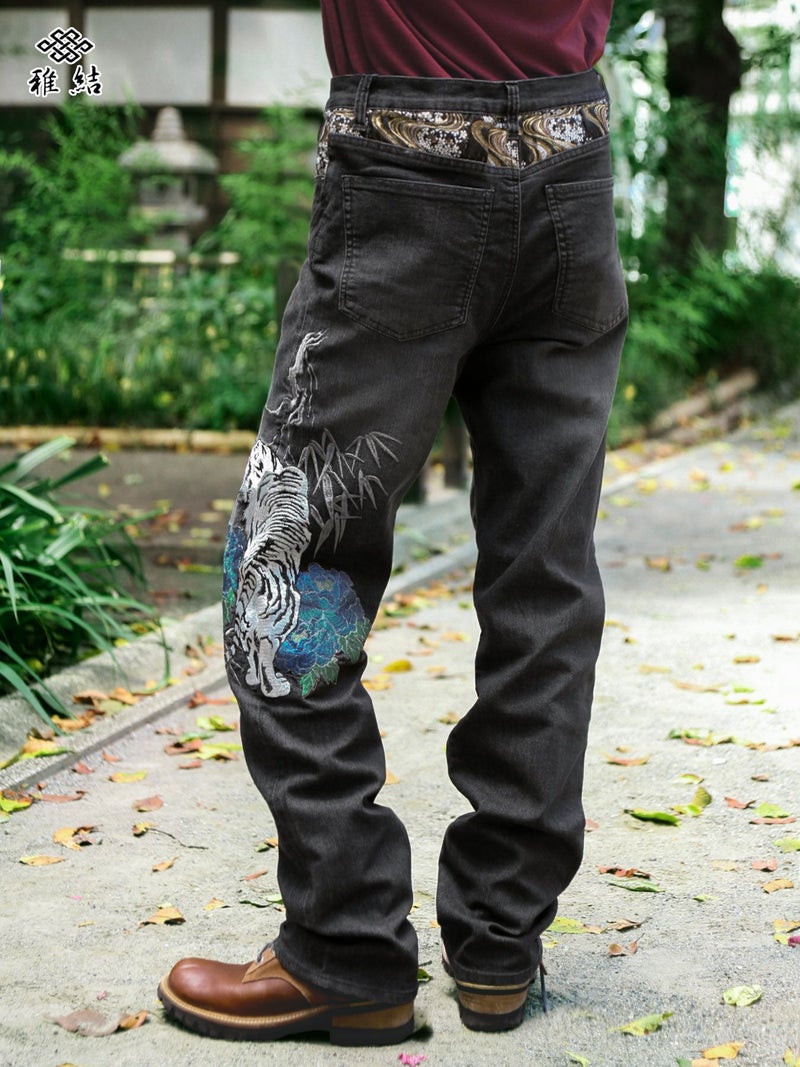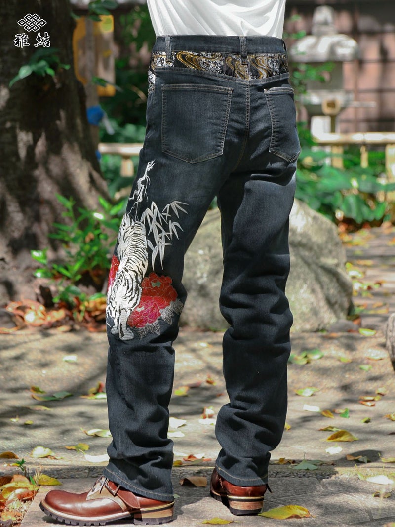 - ≪20%OFF≫【雅結】“白虎と牡丹”総刺繍 金襴切替ストレッチデニムパンツ≪返品・取寄対応不可≫