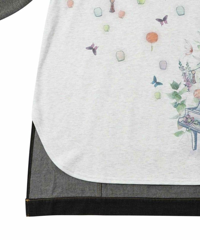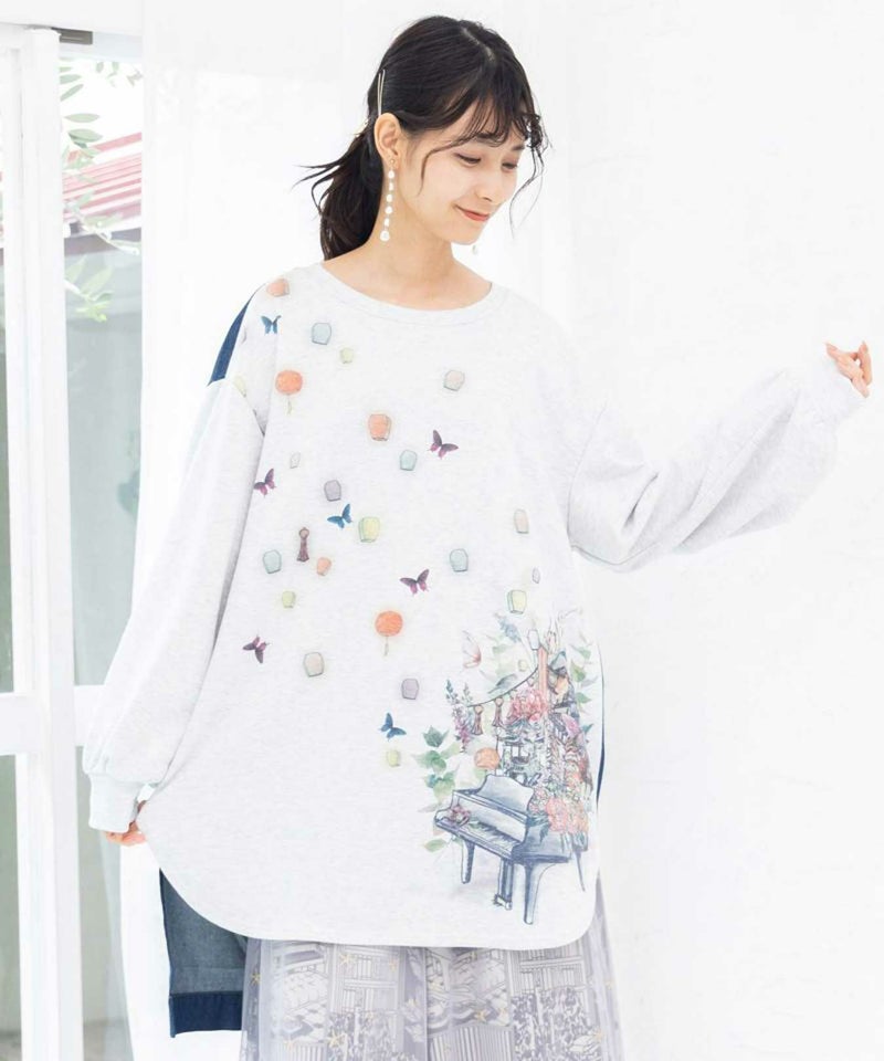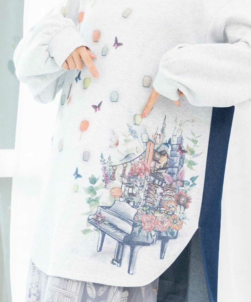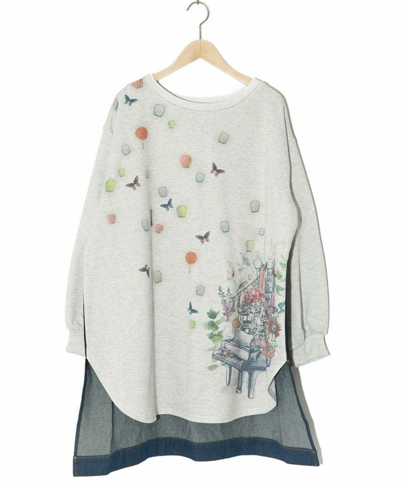 天燈節とピアノ柄 デニム切替裏毛ワンピース