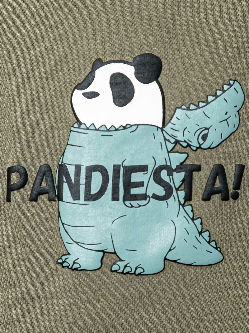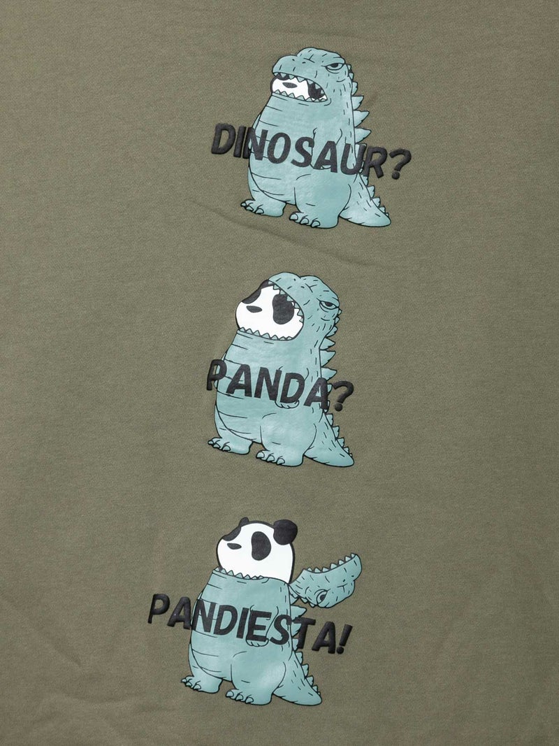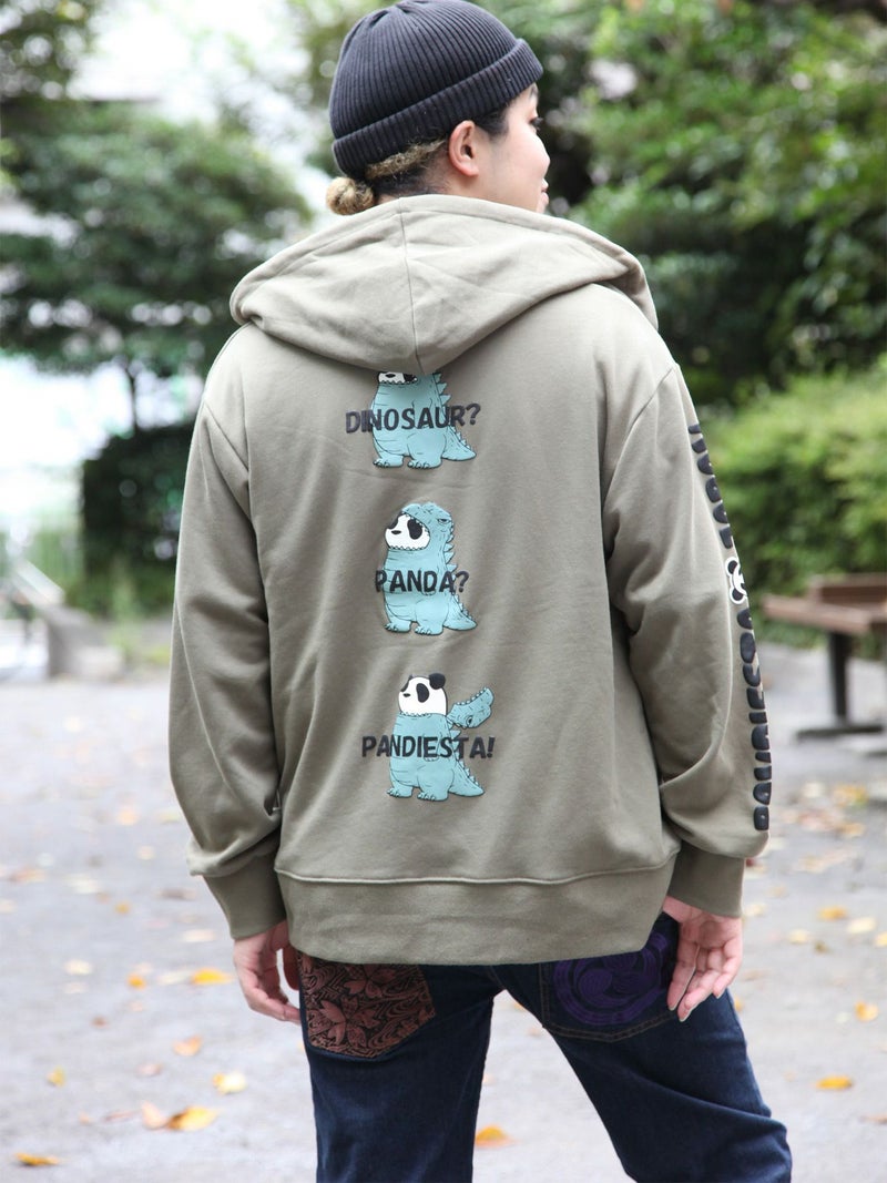 恐竜の着ぐるみを着たパンダという、ユーモア溢れるストーリー性抜群のフルジップパーカー。