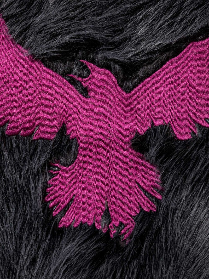こちらはブランドを象徴する「カラス」をメインモチーフに採用したフェイクファージャケットです。