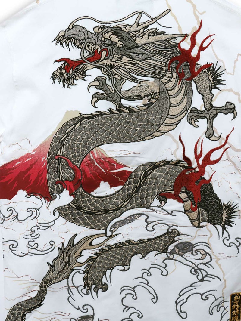 背面には、鱗の一枚一枚まで緻密に刺繍で描かれた龍神の姿が。