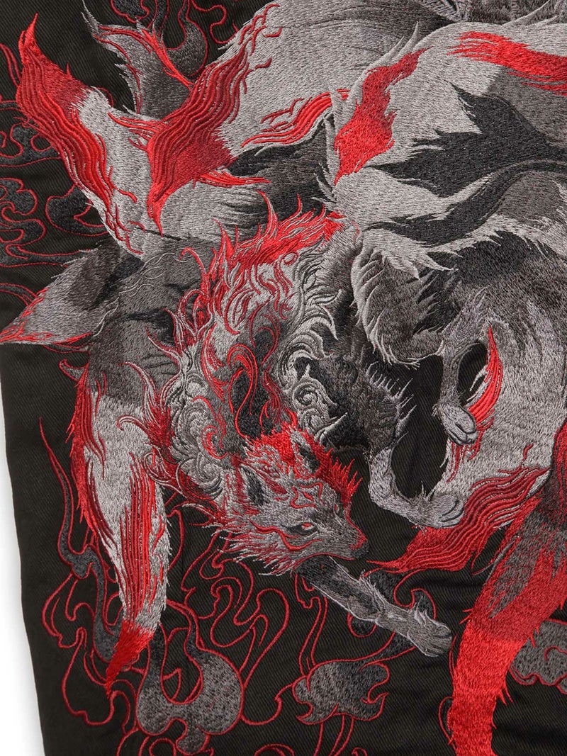 その背景と左脚には、燃え盛る炎をアウトラインのみの単色刺繍で描くことで、毛並みまでリアルに表現された九尾をより引き立たせています。