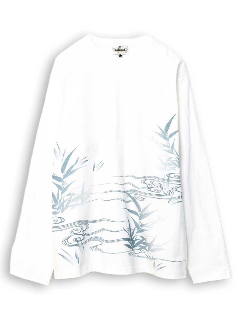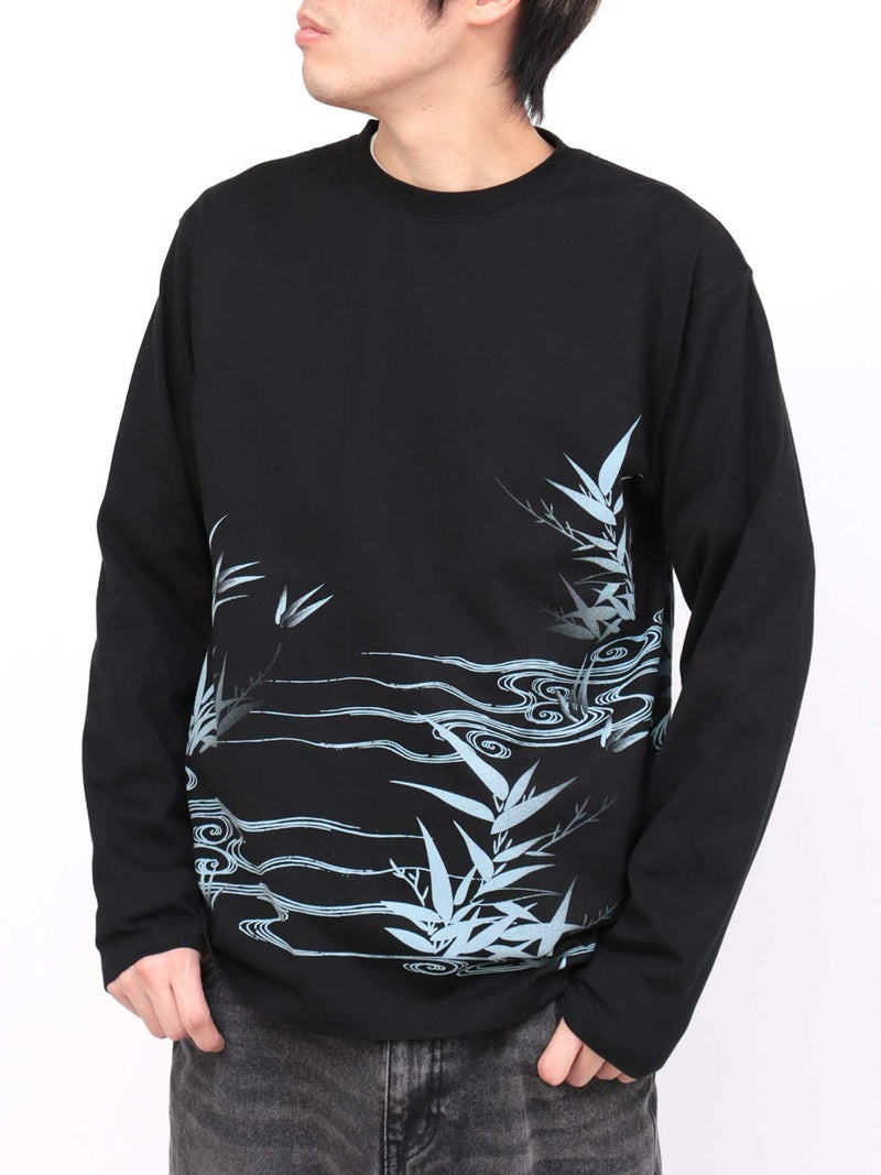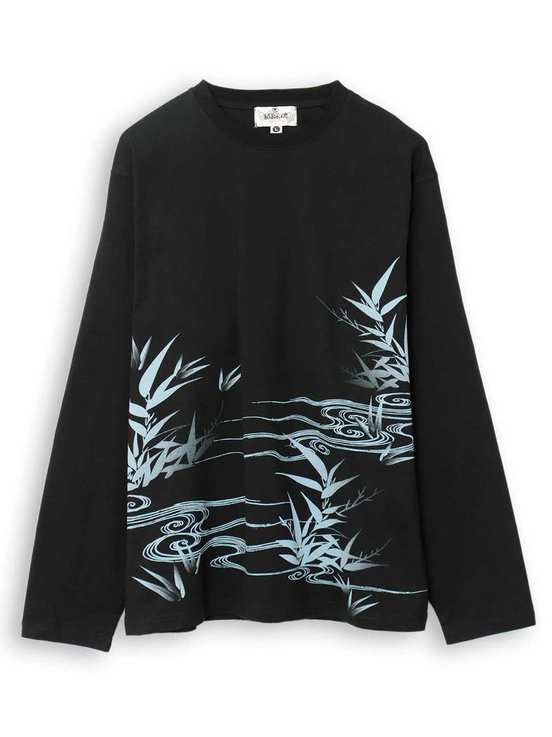 そして背景と前面の、水墨画のようなタッチで描かれた流水と笹のグラデーションプリントが、上品な和の世界観を演出しています。