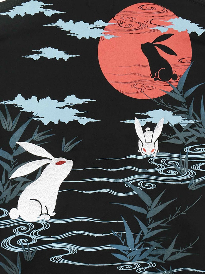 お月見を楽しむウサギと水面で戯れるウサギ。可愛すぎないシンプルな刺繍であしらうことで、男性でも着やすい仕上がりに。