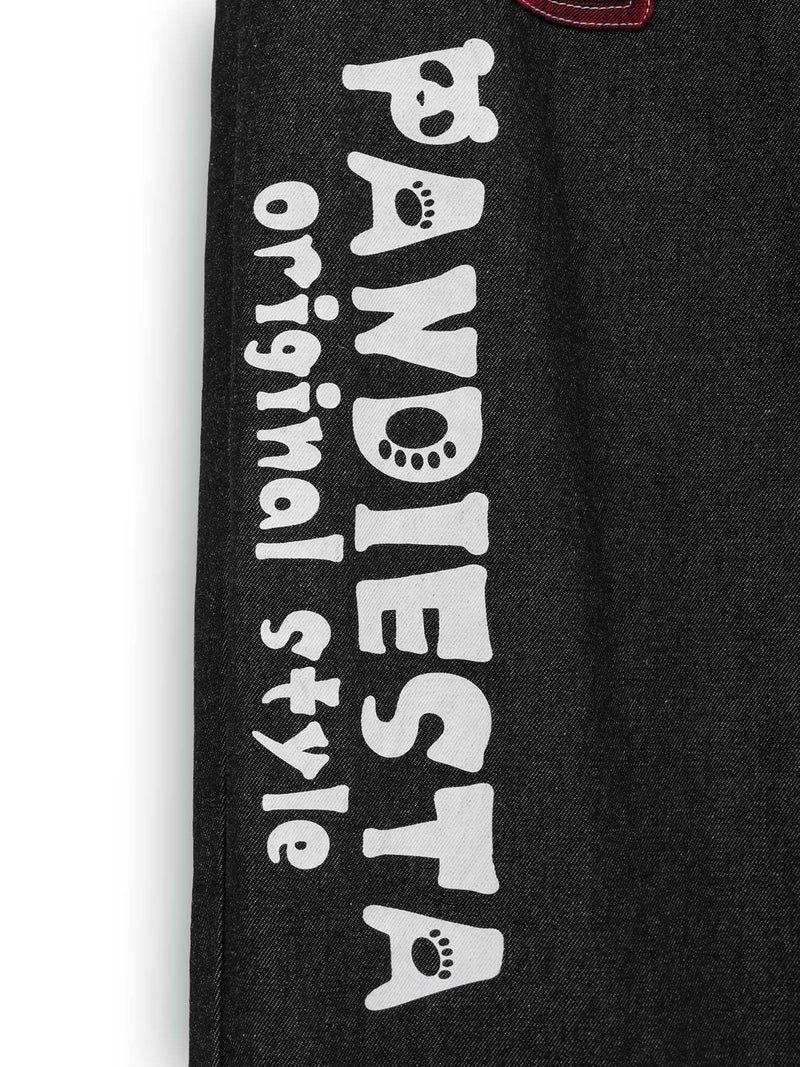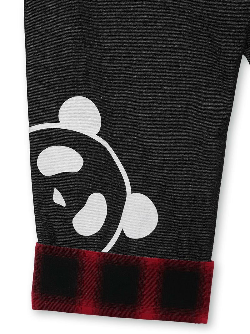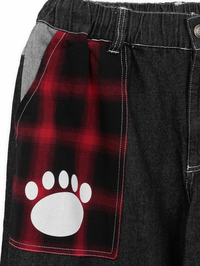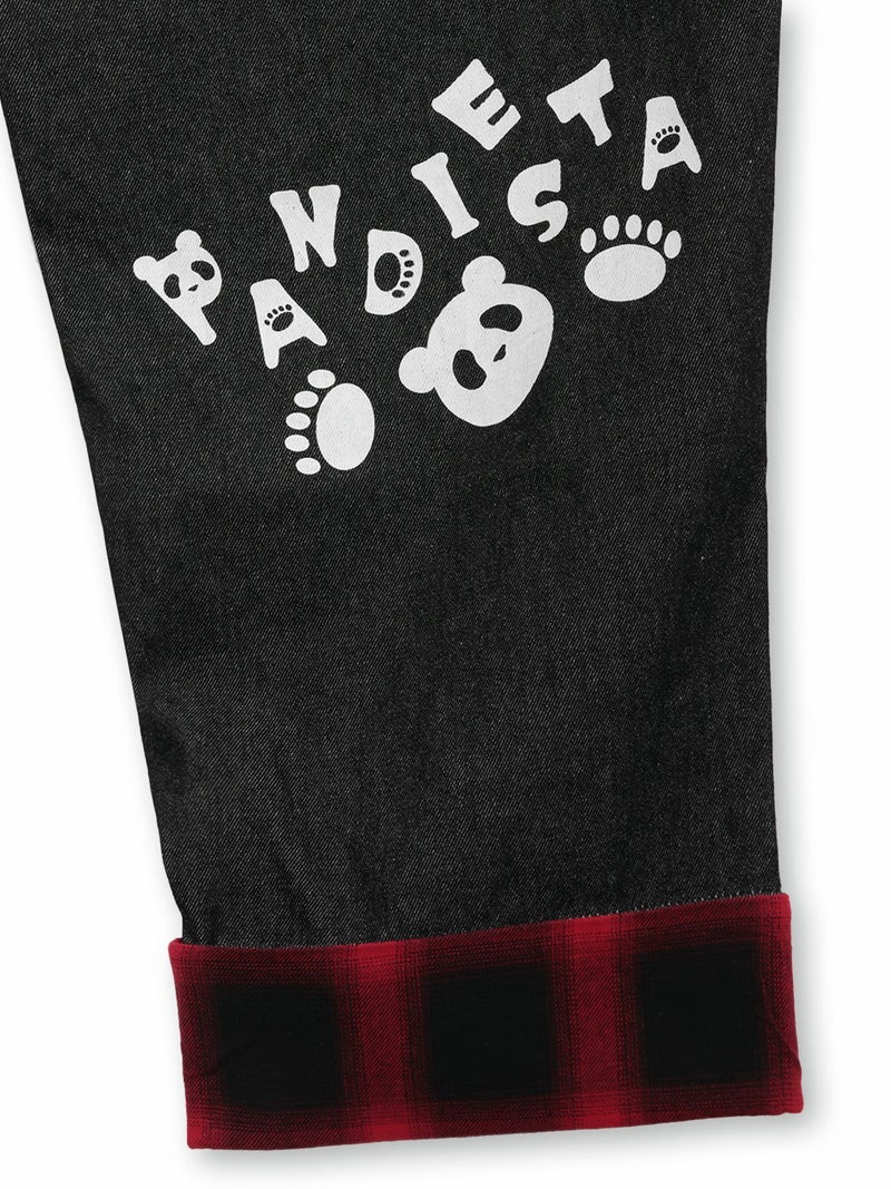 ポケットやヨーク部分はデニムの裏地やチェック生地で切り替え、ポップなデザインのロゴなどを全体に散りばめた可愛らしい仕上がりに。