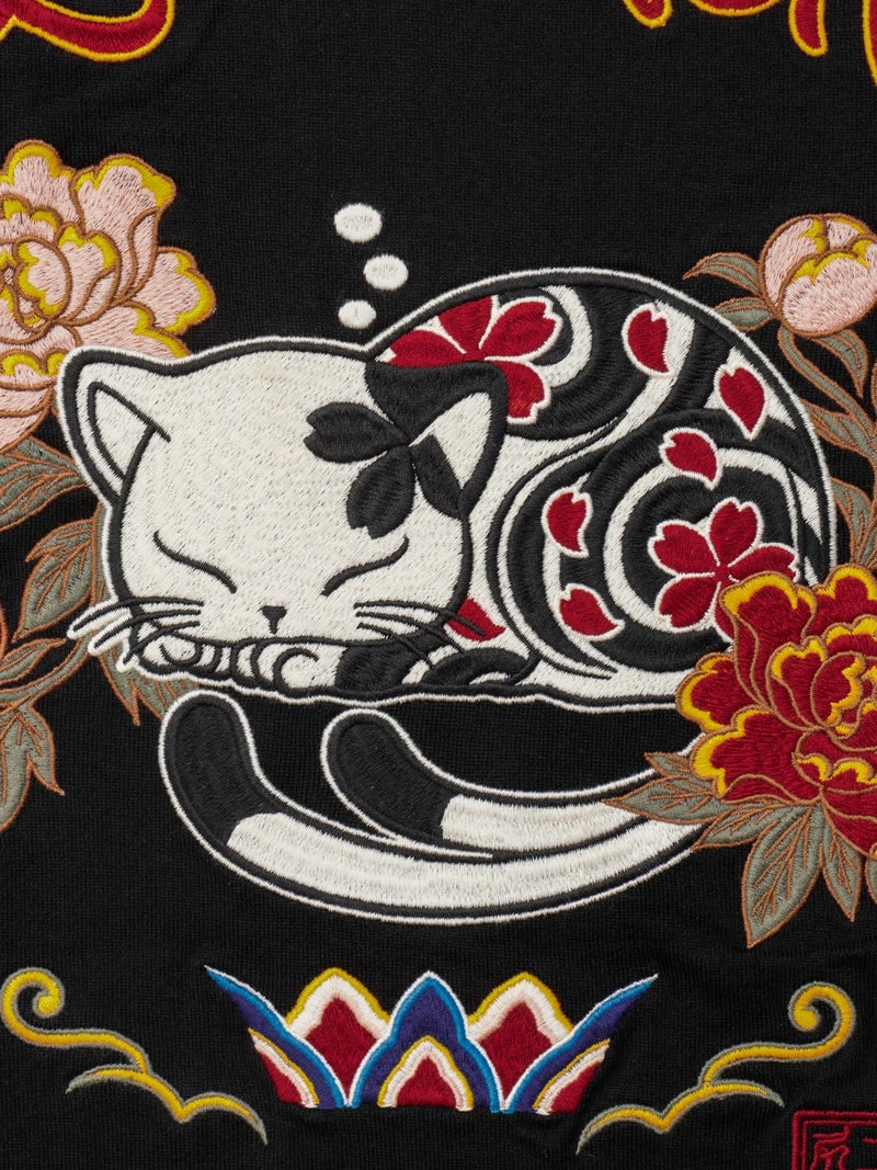 背面には、牡丹の花に囲まれ、日の光を浴びながらうたた寝するスミネコの姿を、緻密な刺繍で表現しました。