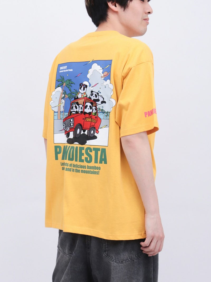 カラフルなグラフィックと、アメ車に乗ったパンダたちの刺繍が目を引く、遊び心たっぷりの一枚です。