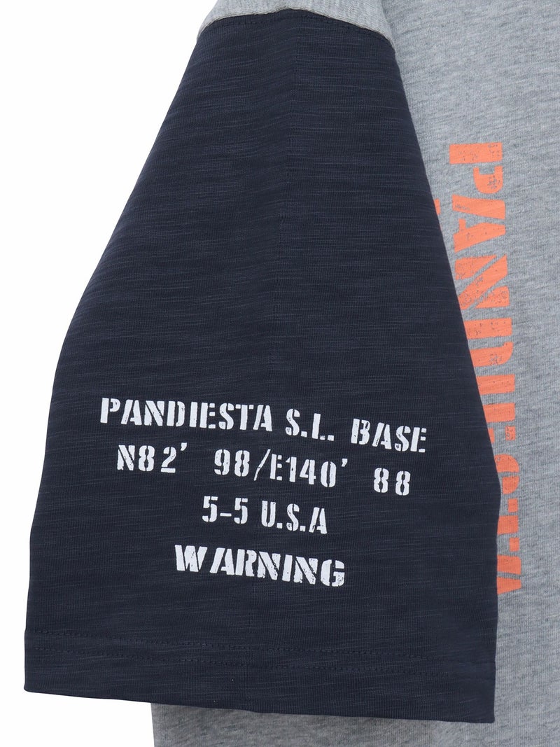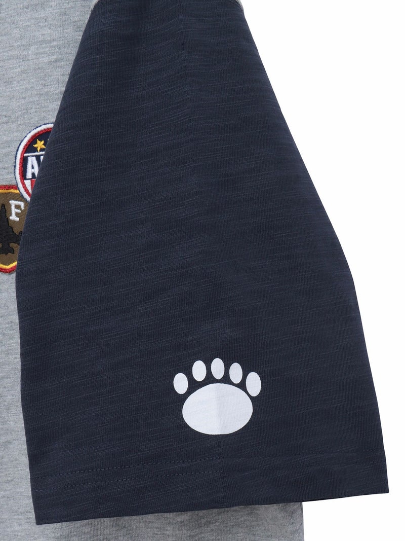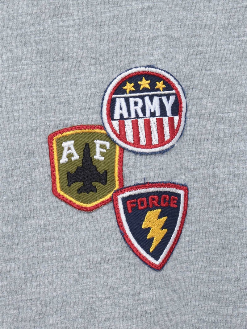 袖や胸元には、ミリタリーロゴをプリントし、胸元には腕章風のワッペンアップリケもオン。