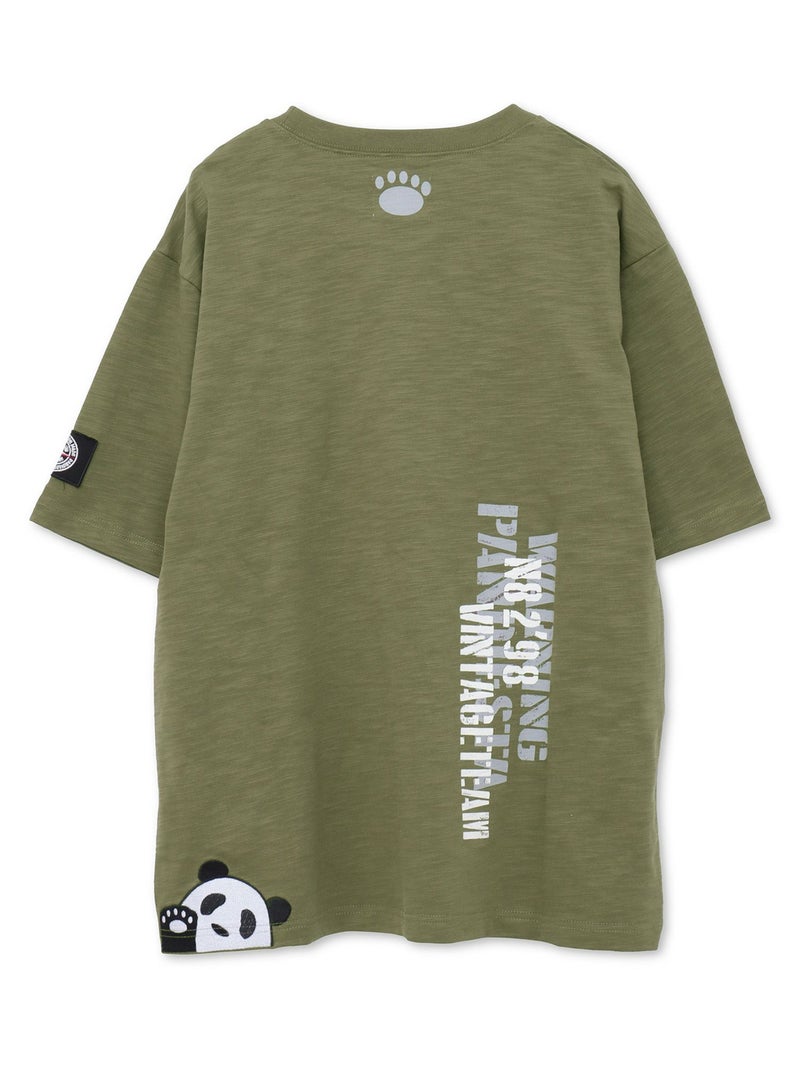 前面には、胸のラインにミリタリー調のブランドロゴがプリントされており、その隣で手を振るパンダが刺繍で描かれています。