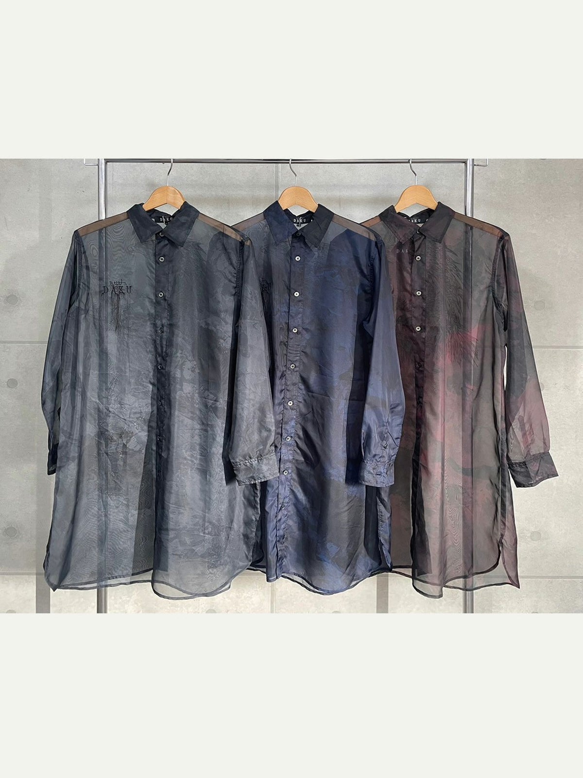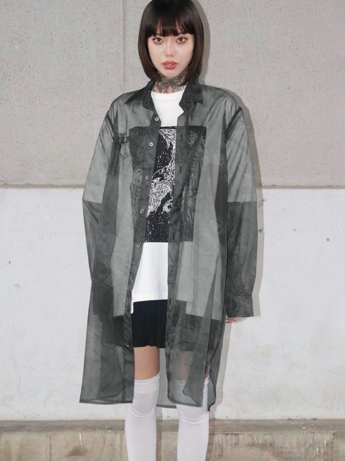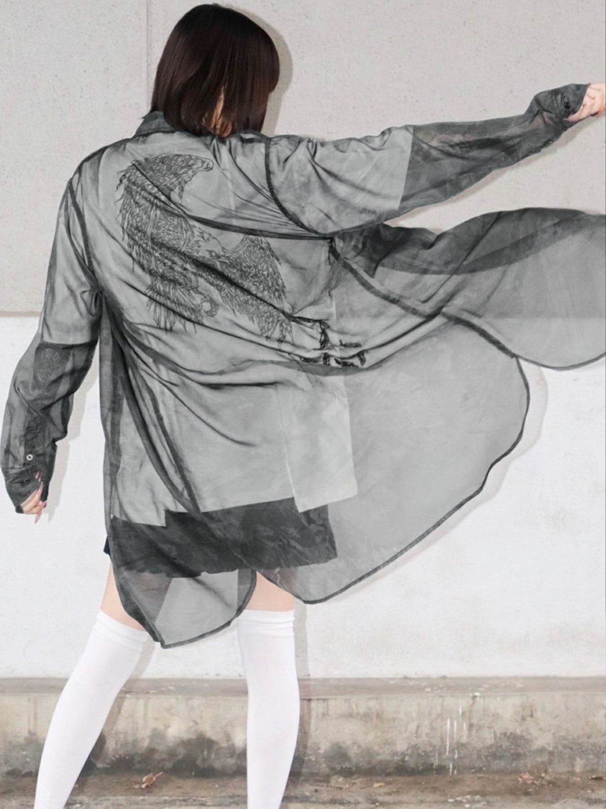カラスプリントシアー素材 半袖ロングシャツ