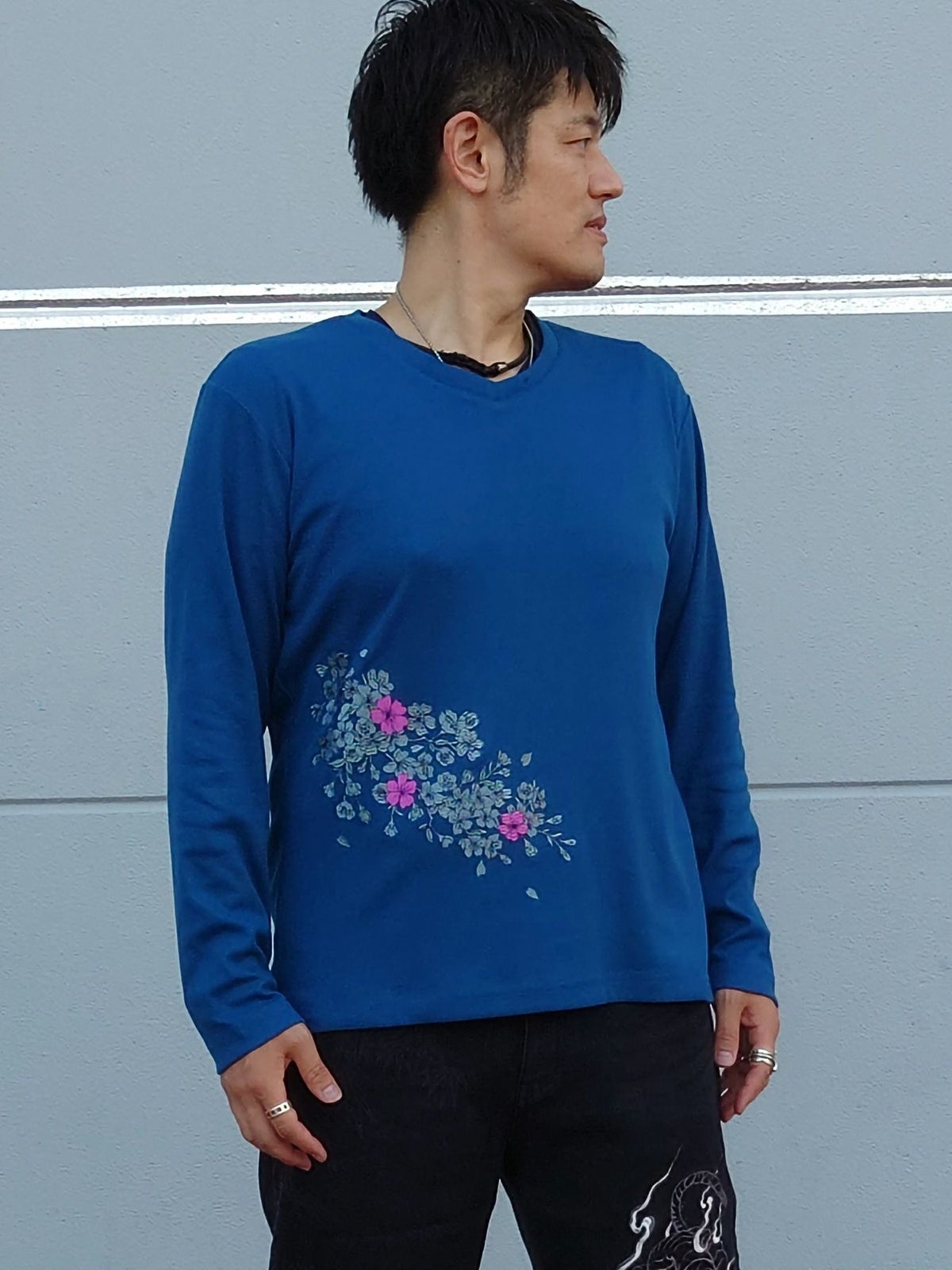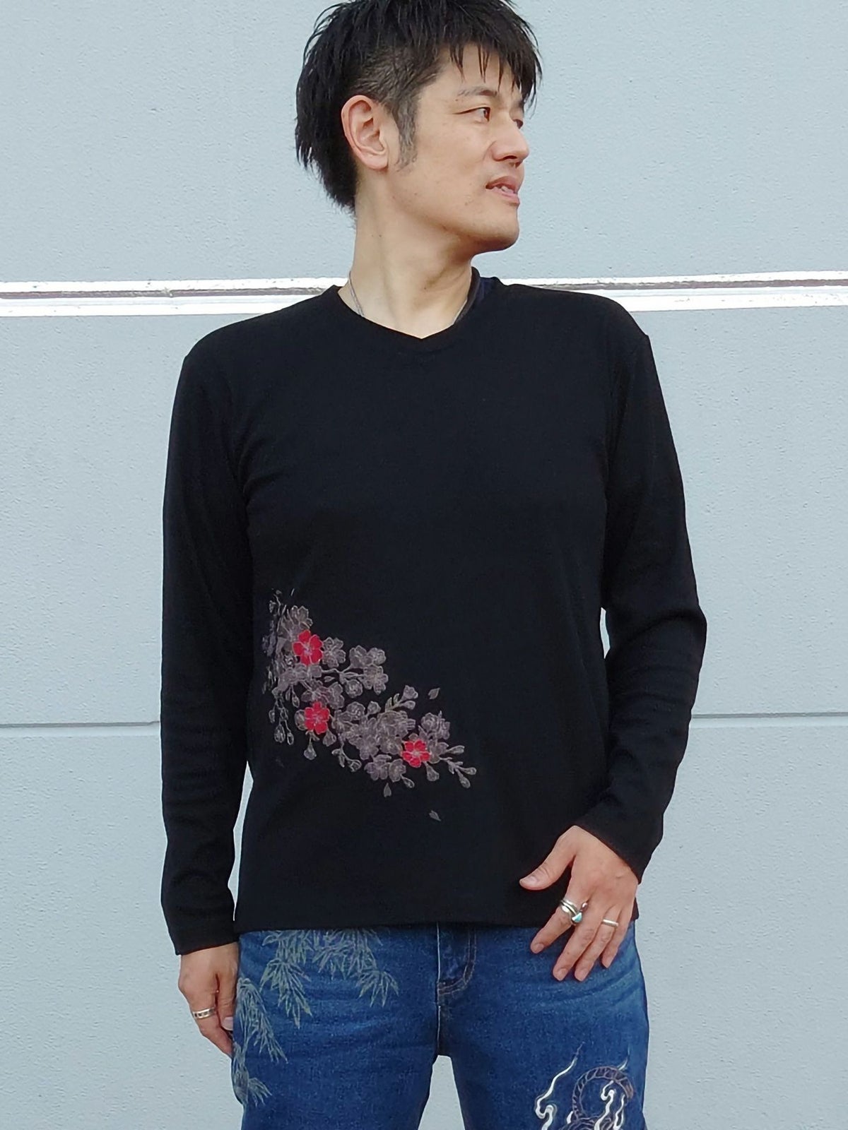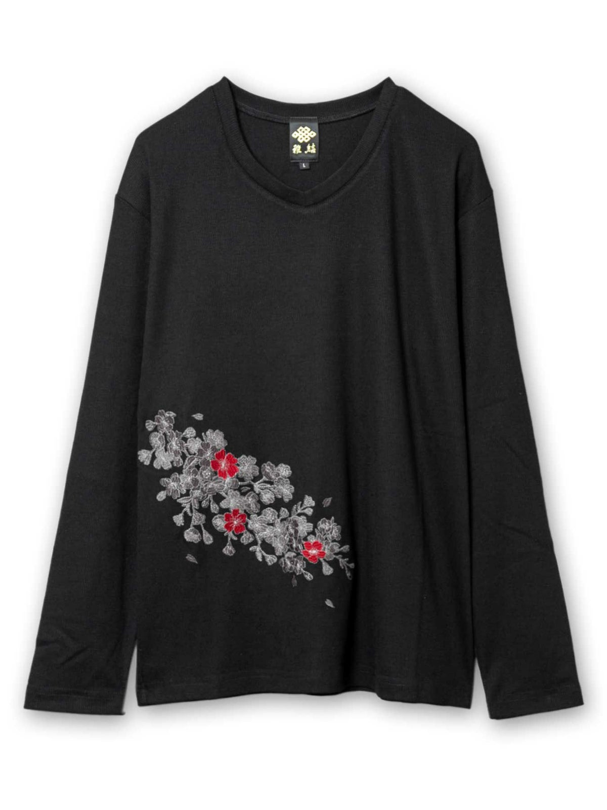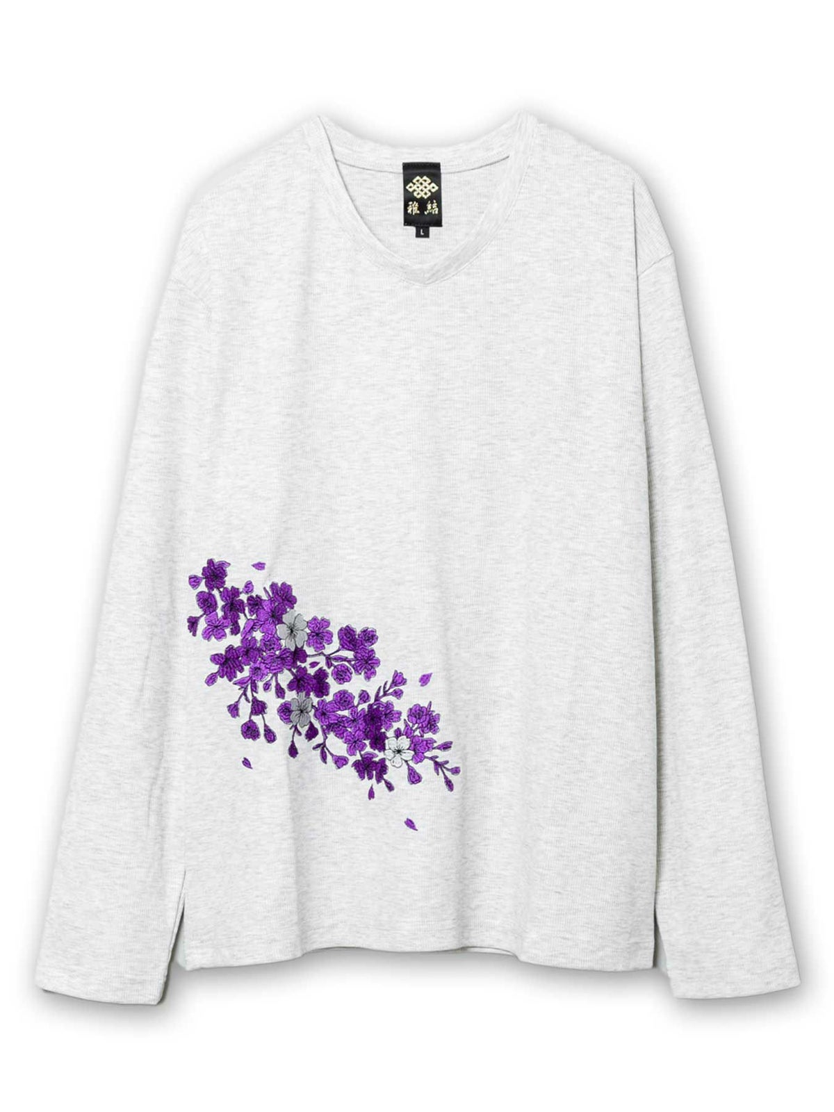 桜刺繍 テレコ素材VネックロンT≪返品・取寄対応不可≫