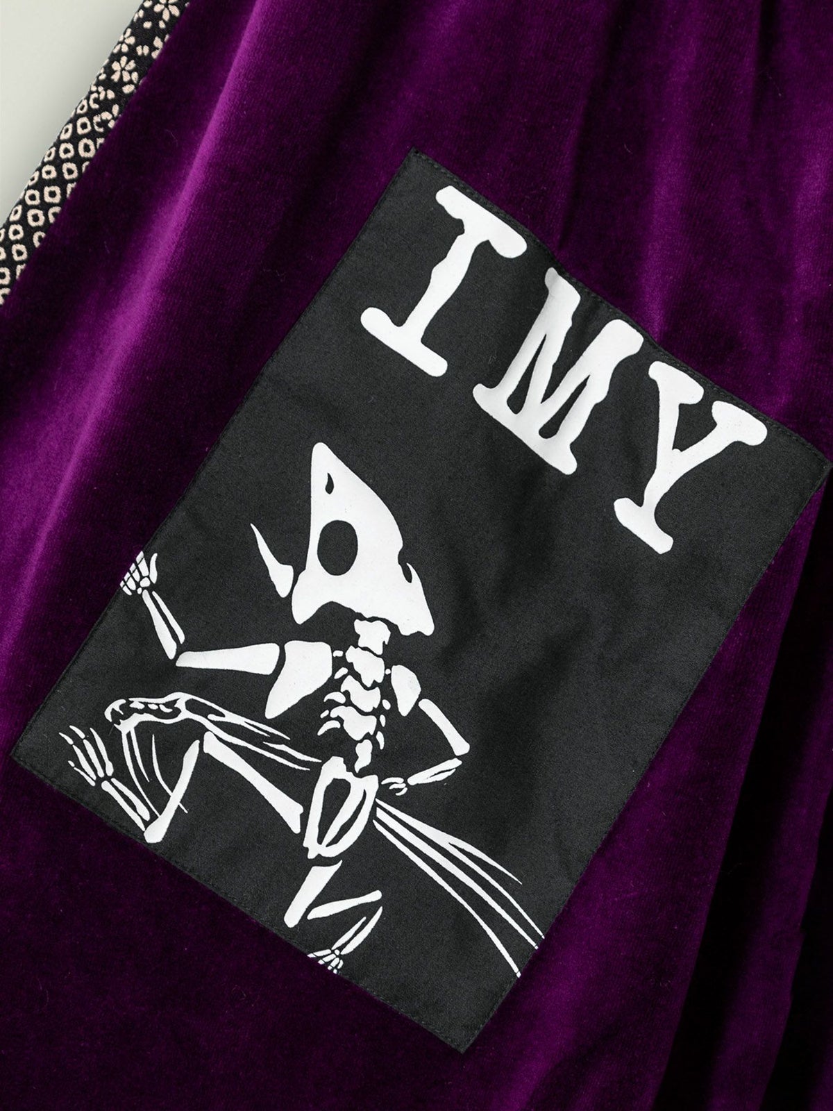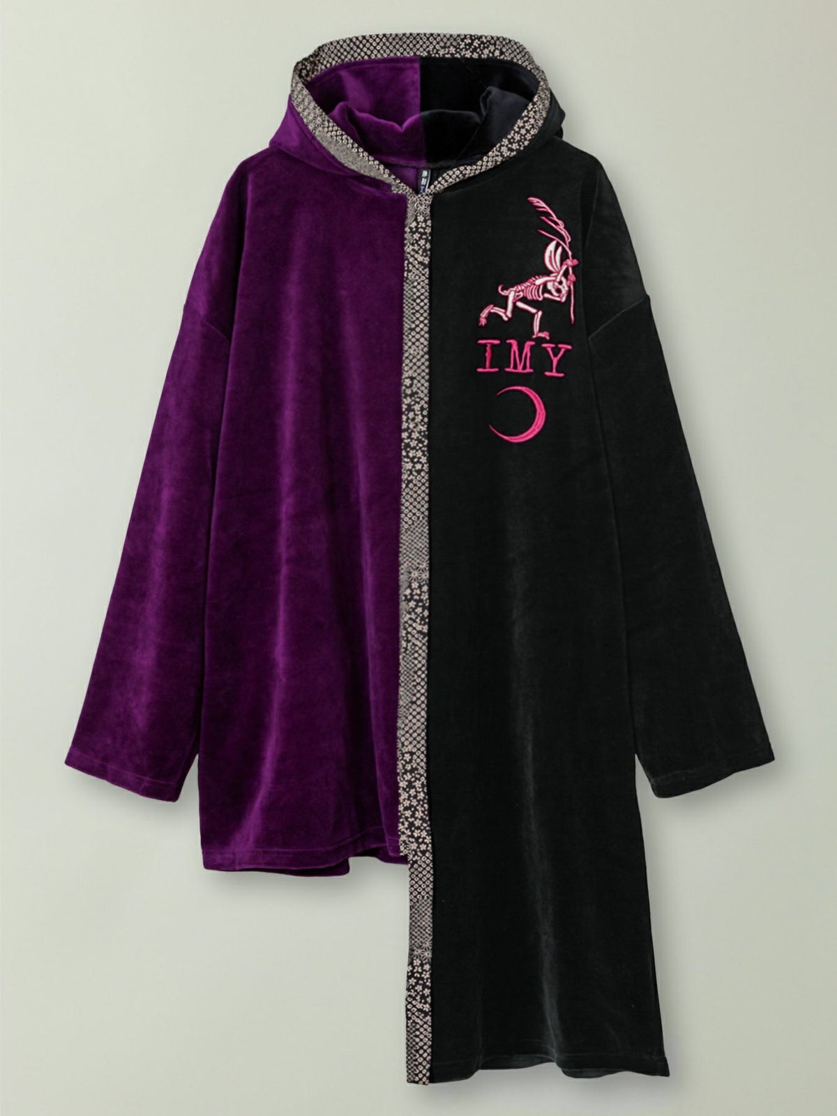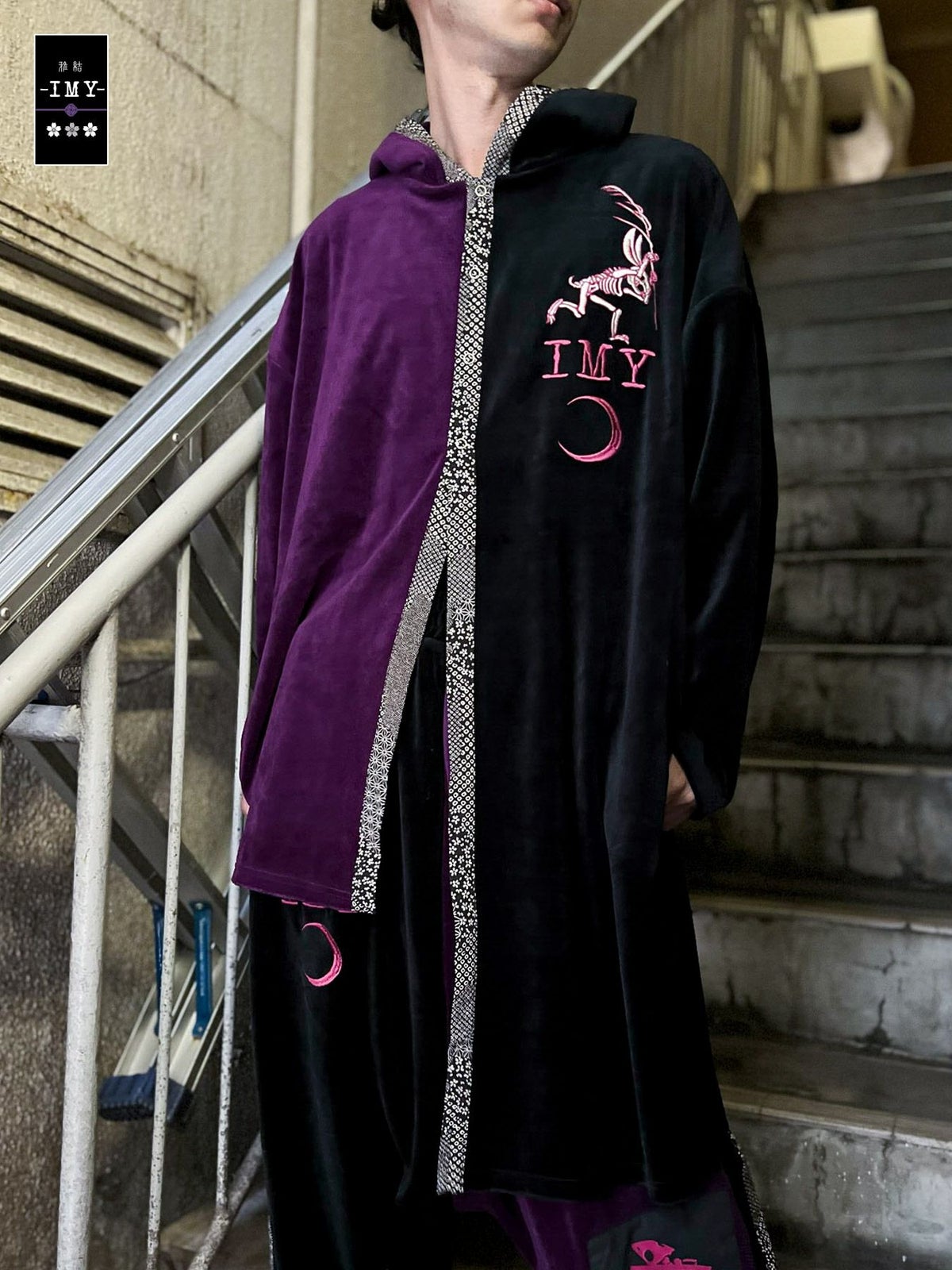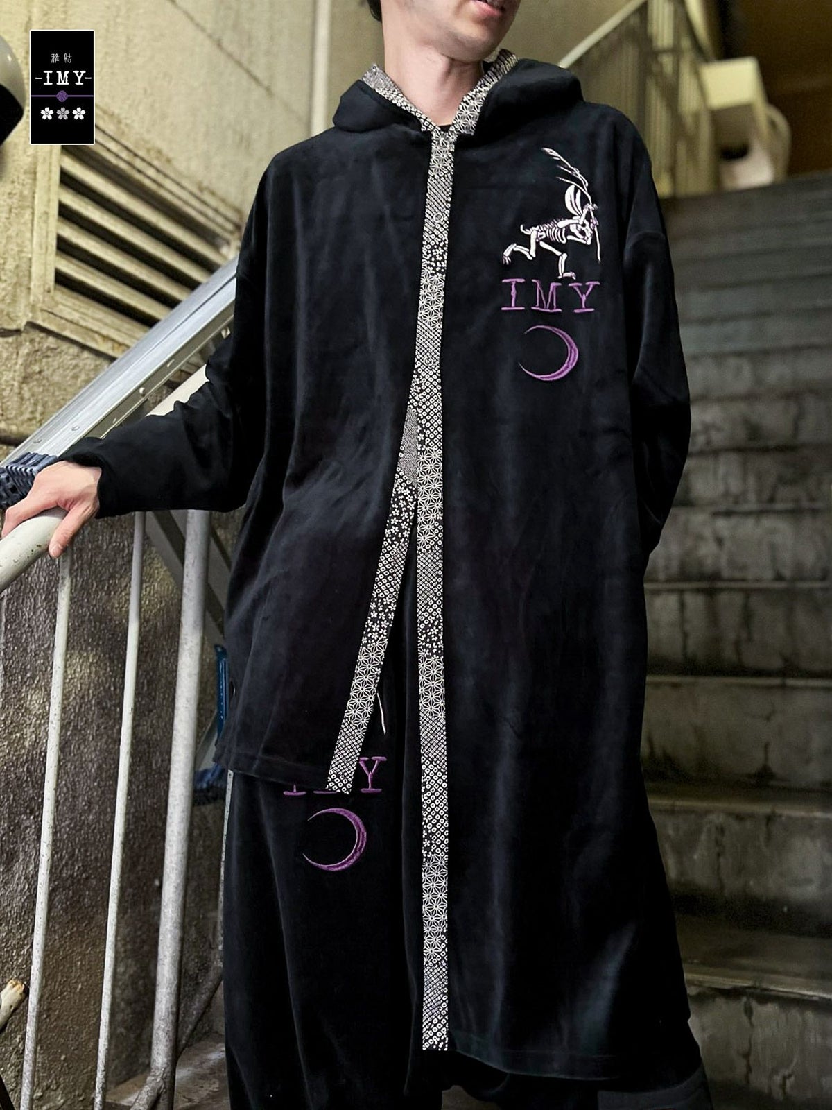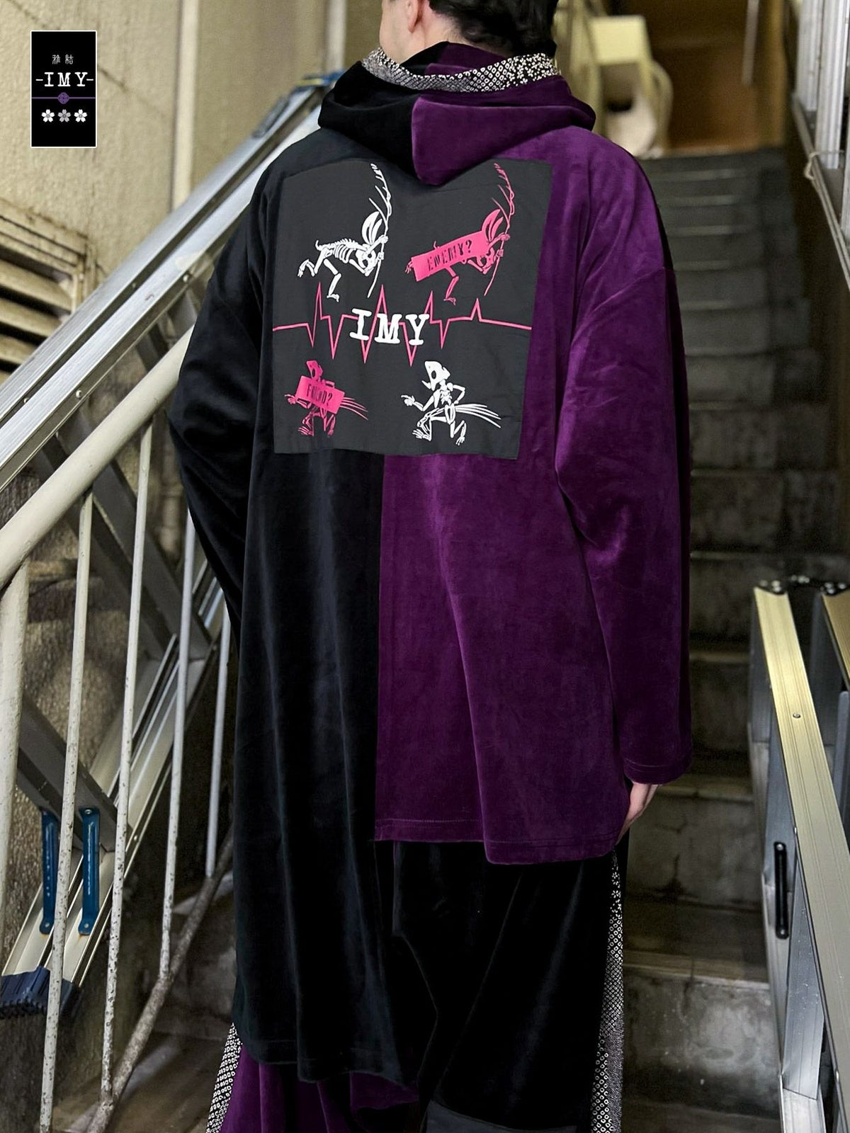 “レントゲン鳥獣戯画”アシンメトリー切替ベロア素材ロングボタンパーカー≪返品・取寄対応不可≫