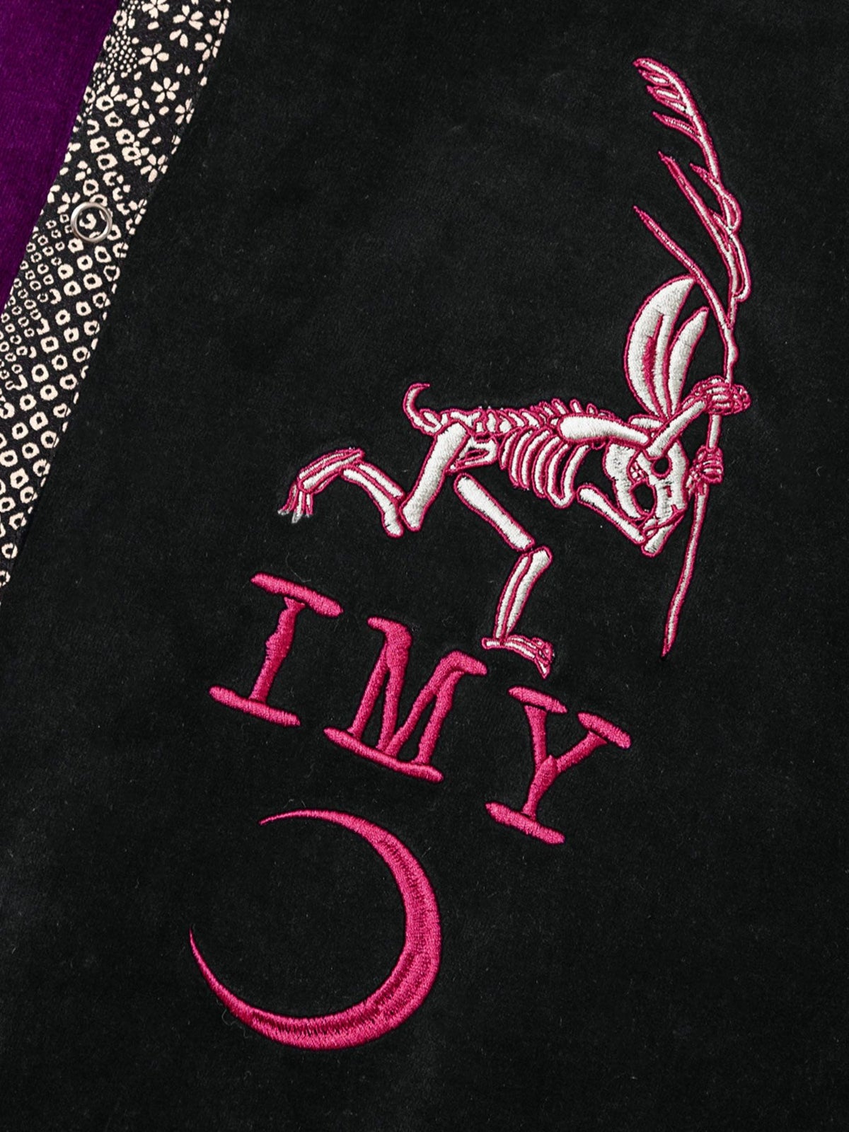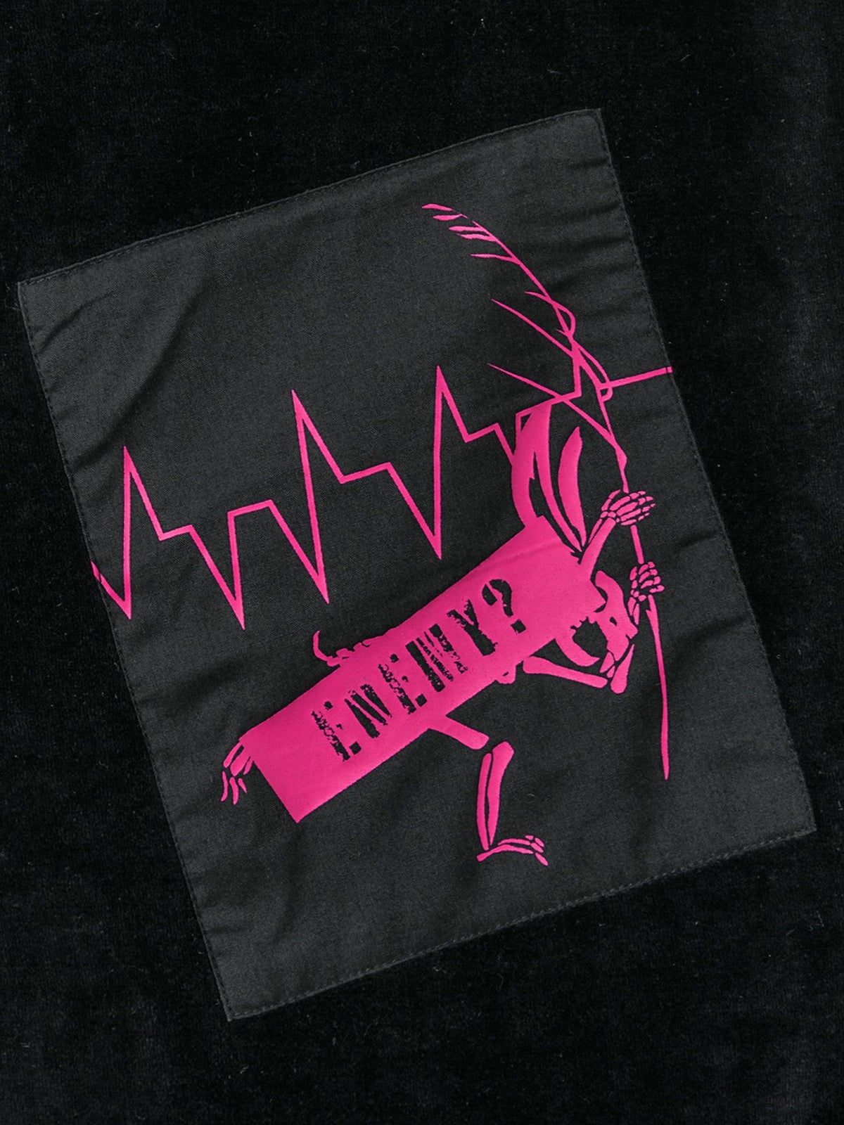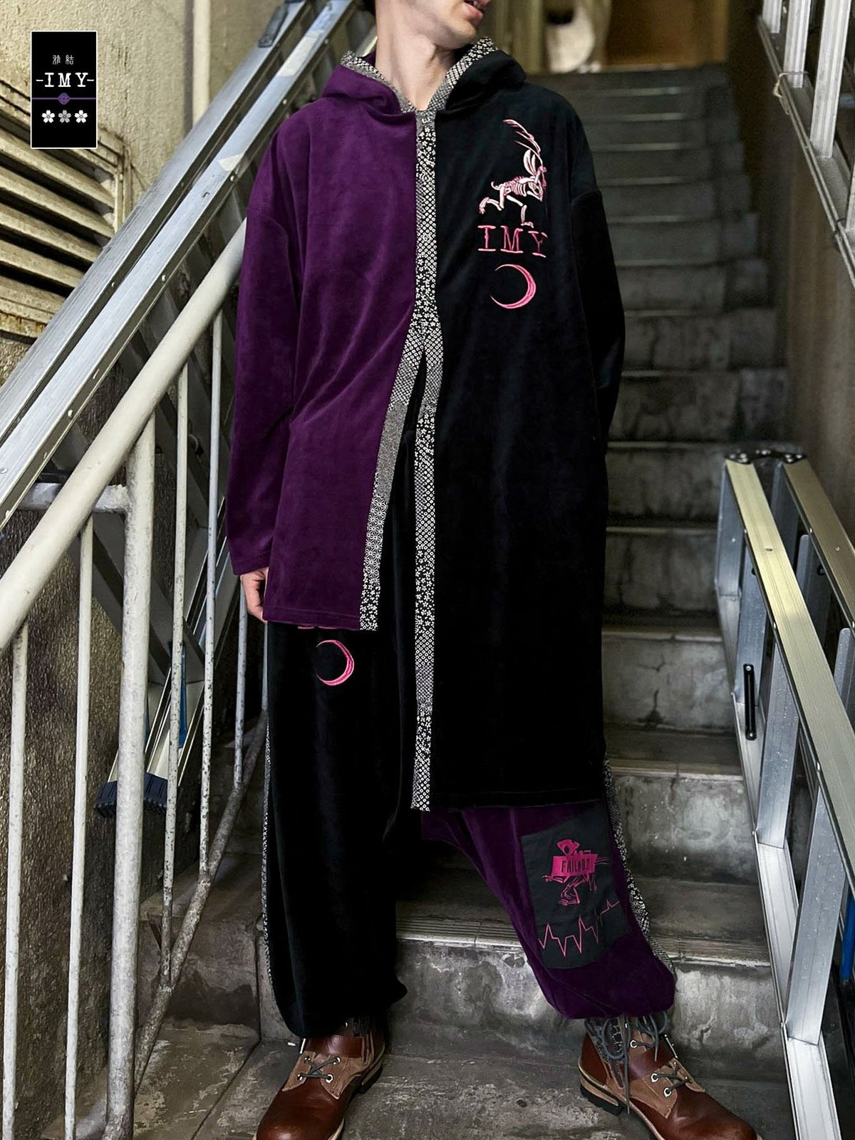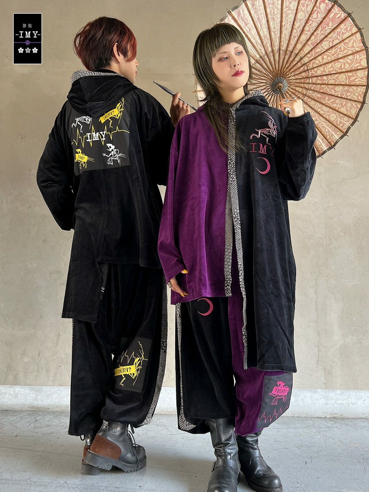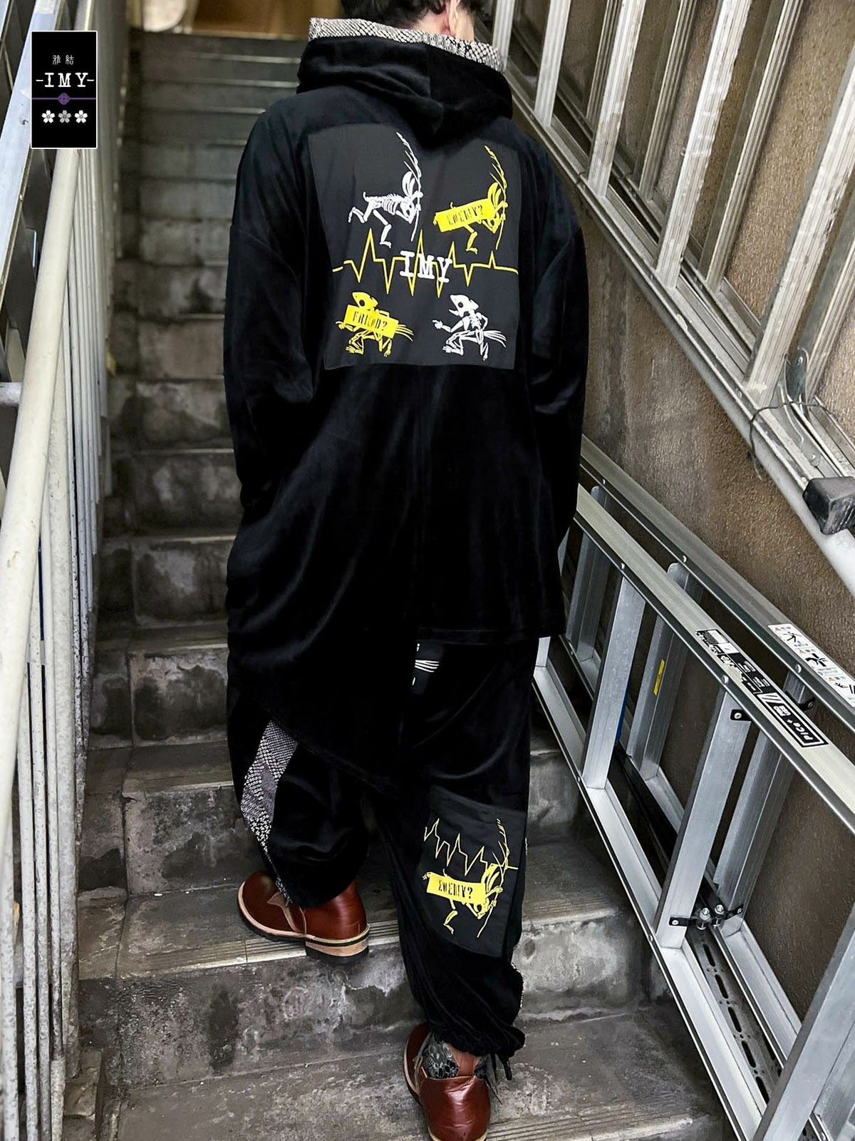 “レントゲン鳥獣戯画”アシンメトリー切替ベロア素材ロングボタンパーカー≪返品・取寄対応不可≫