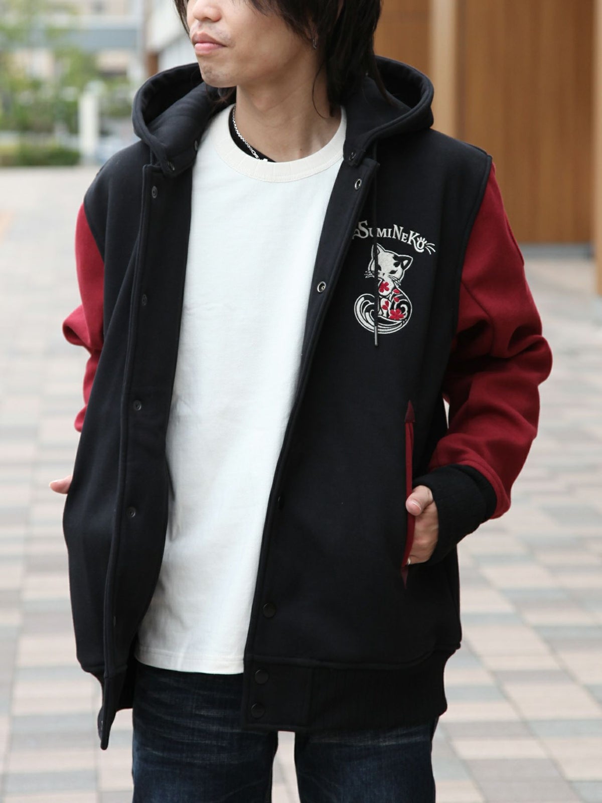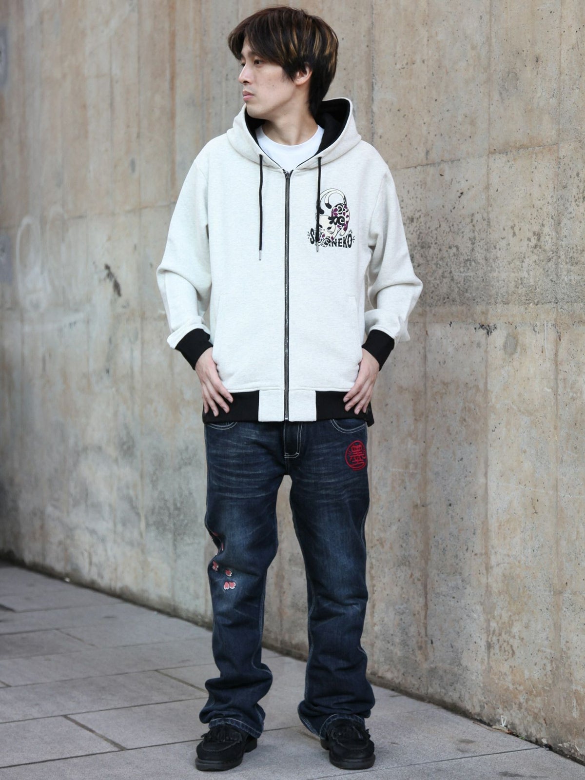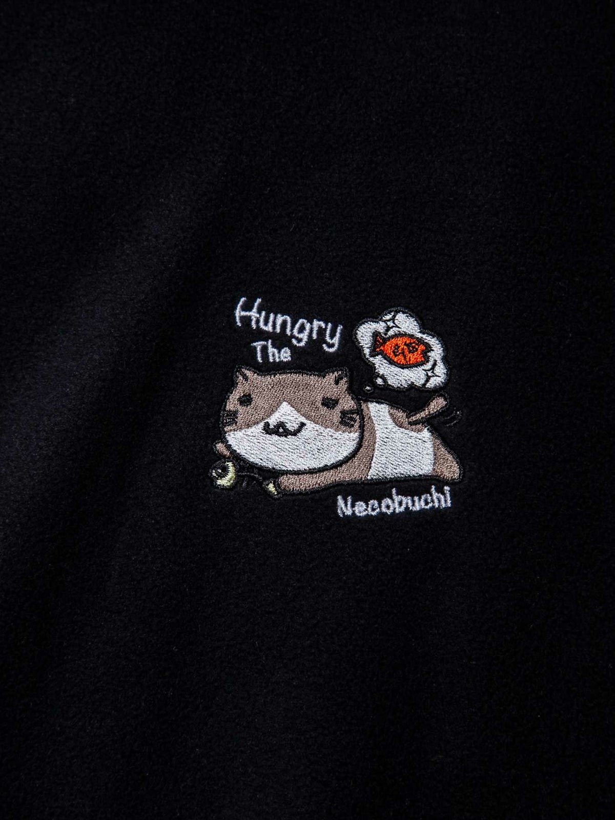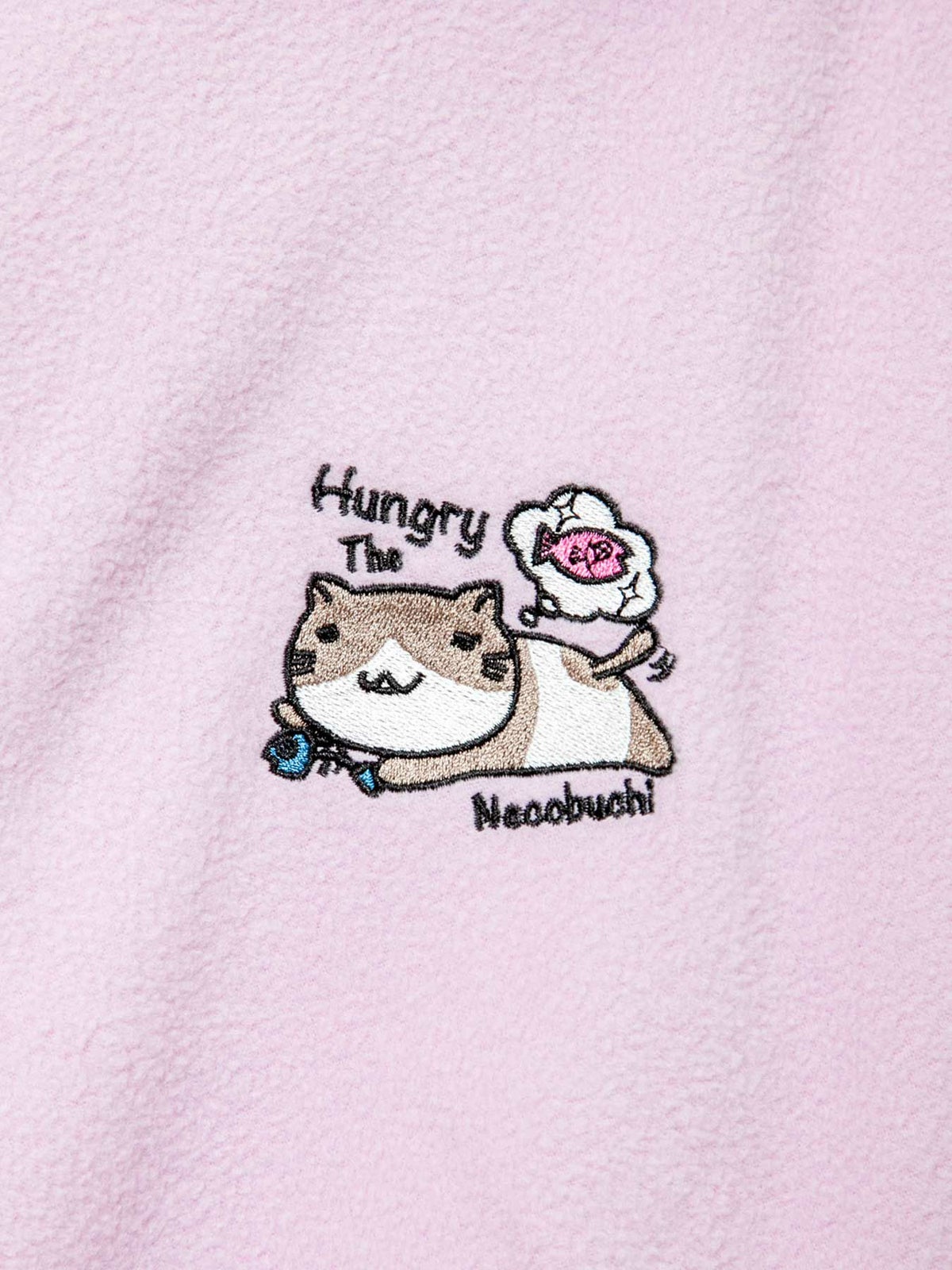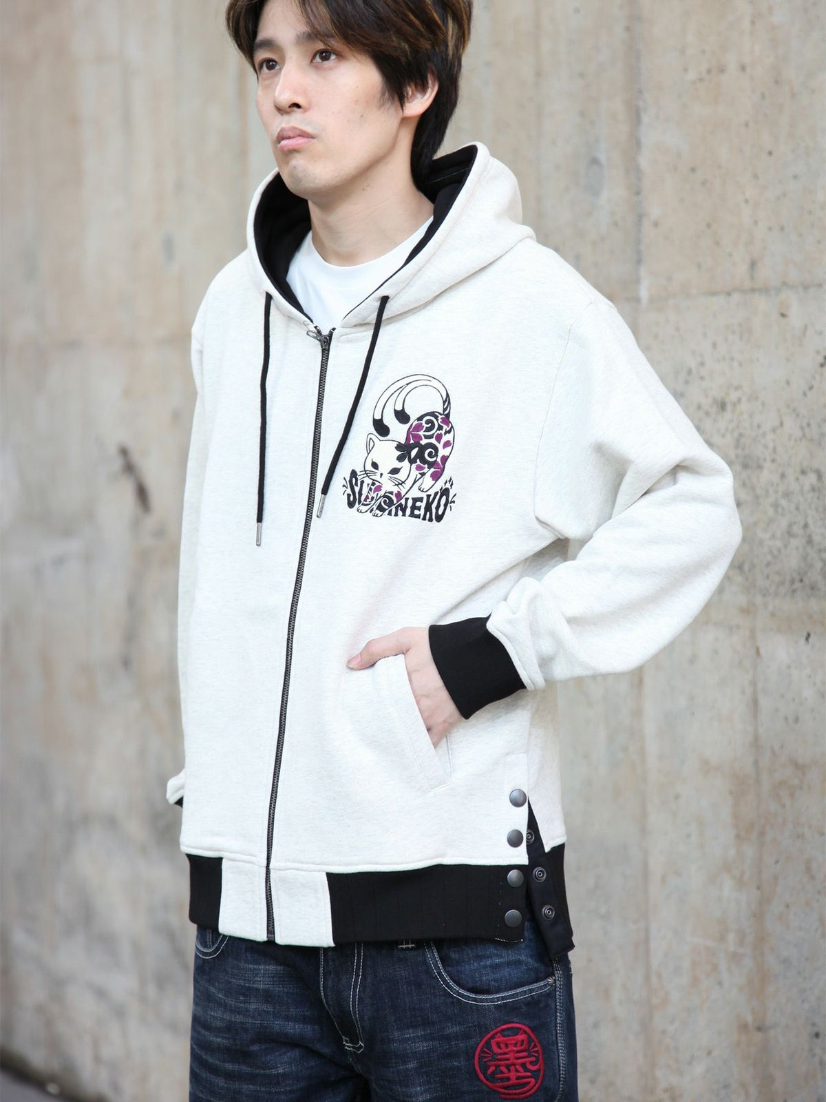 “伸び猫”刺繍入りサイドボタンZIPパーカー