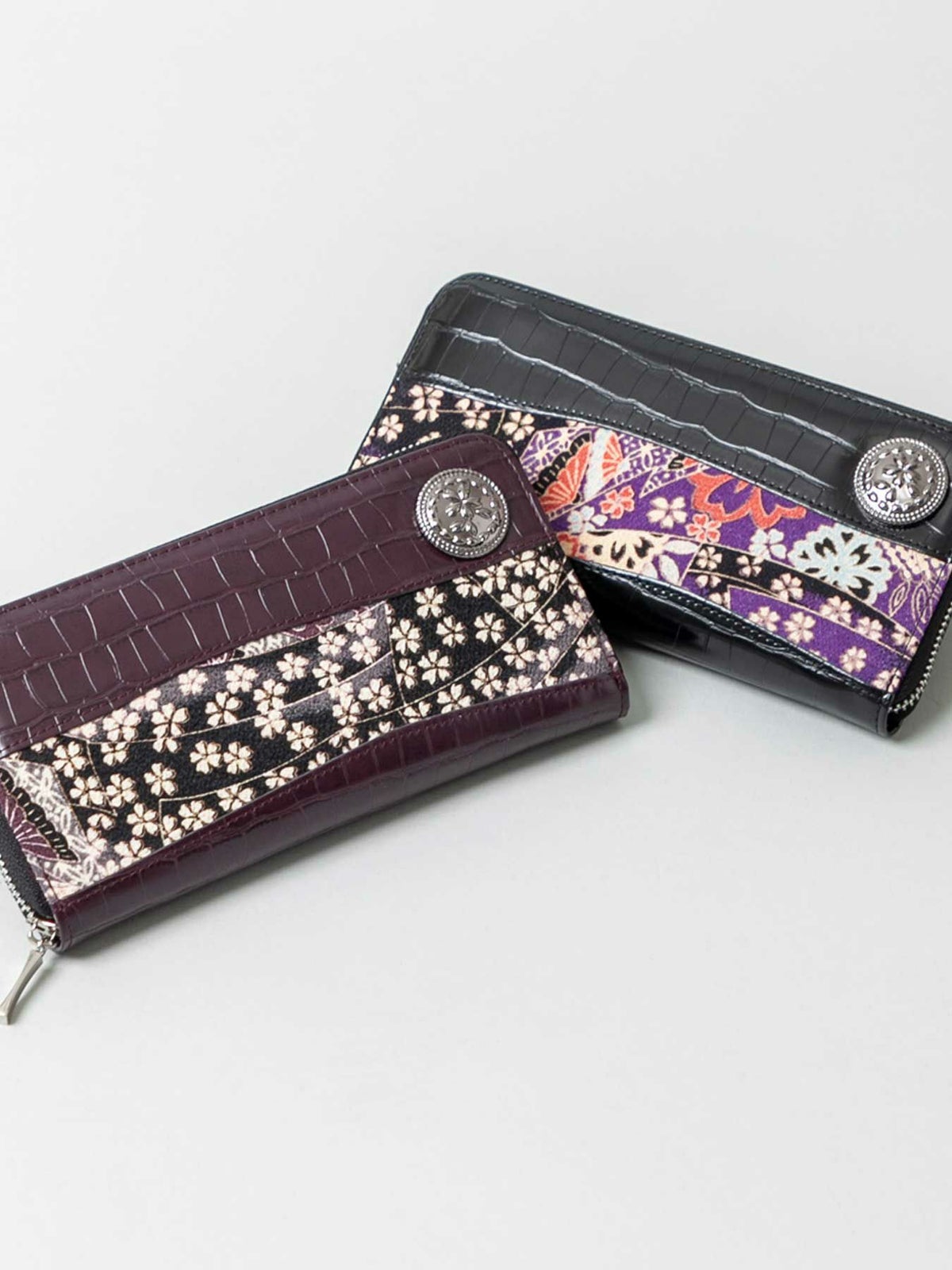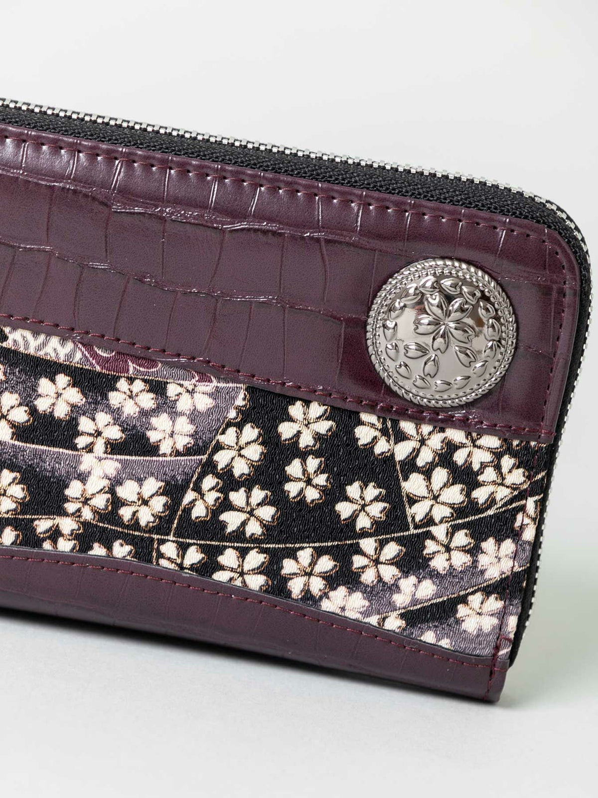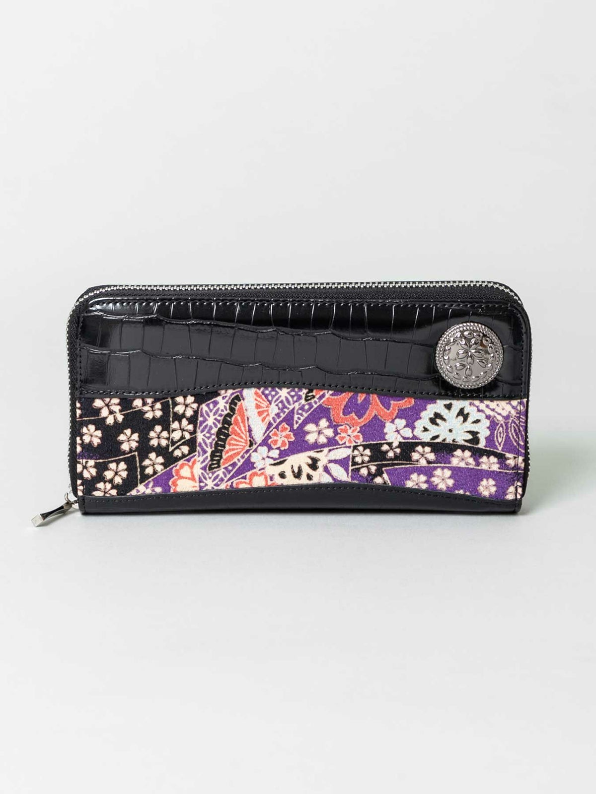 ちりめん×クロコ切替コンチョ付きZIPロングウォレット