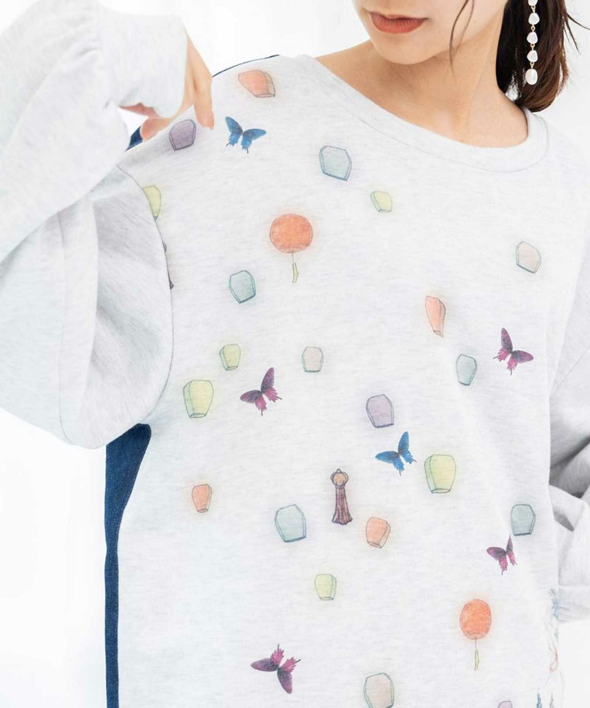 天燈節とピアノ柄 デニム切替裏毛ワンピース