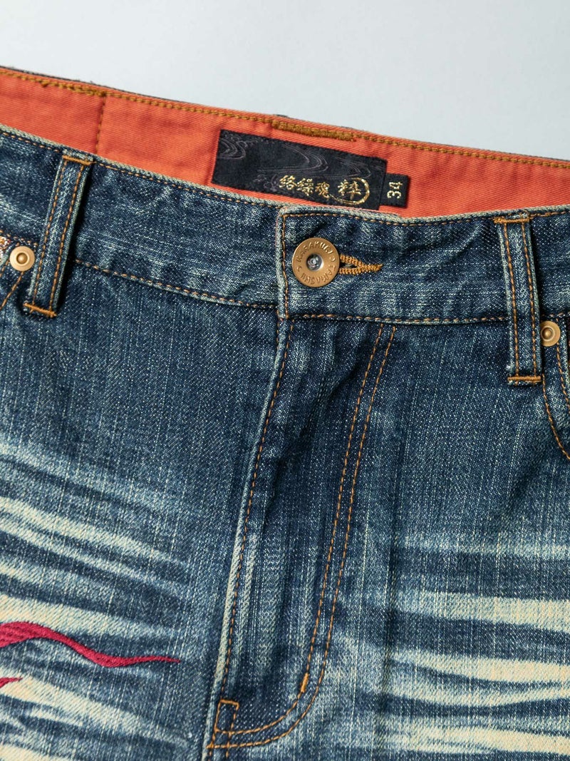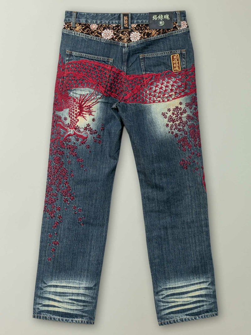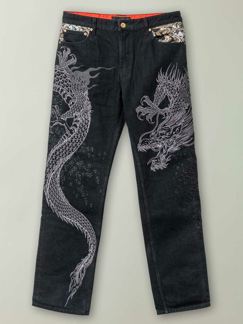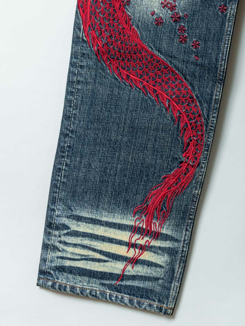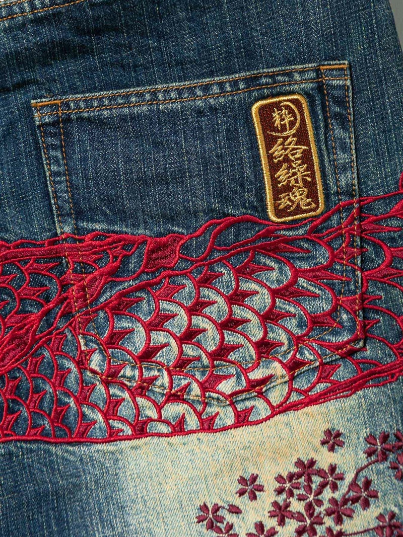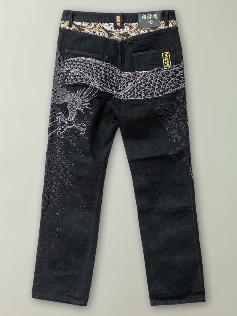 - 【絡繰魂・粋】“巻龍”総刺繍 金襴切替デニムパンツ〔別注〕