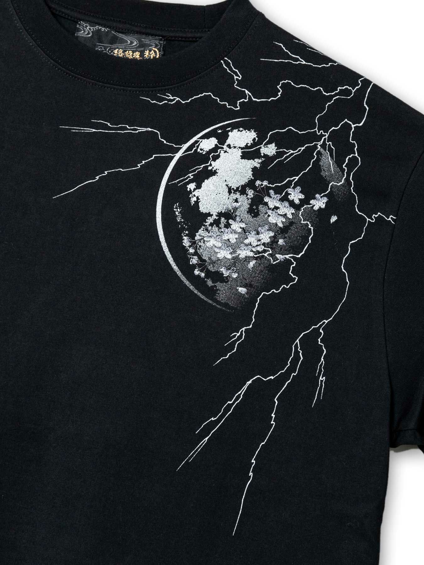 また前面は胸元に月と桜、稲妻を胸元にワンポイントで配し、背面とは打って変わりシンプルな面持ちに。