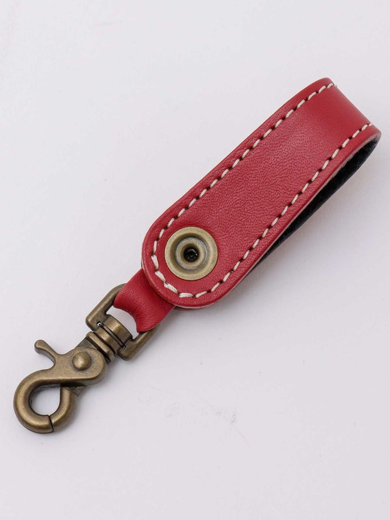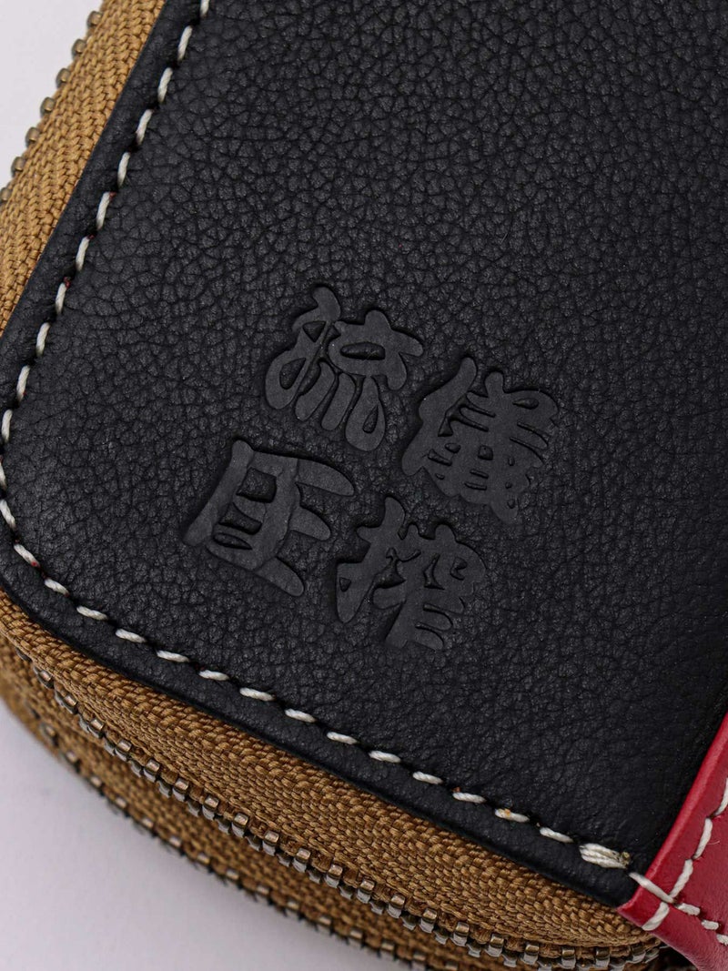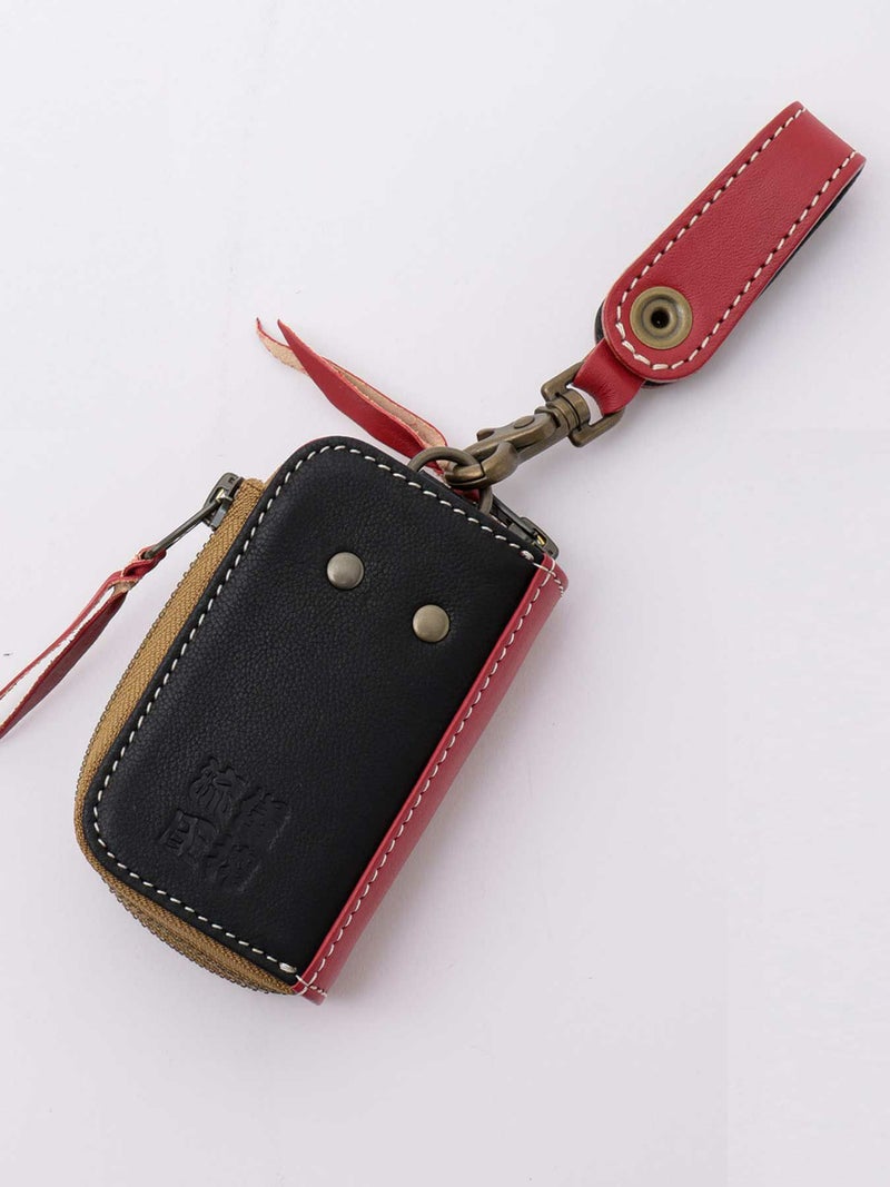 付属のキーホルダーやファスナーの引き手に至るまで、赤黒に拘った配色で仕上げています。