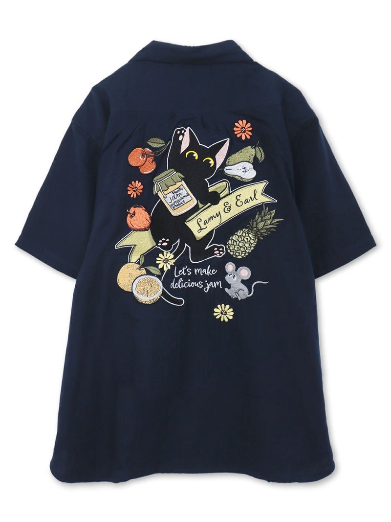 こちらは、たくさんの果物とジャムの瓶を抱えたラミと、それを眺めるアールの姿を描いた可愛さ爆発の開襟シャツ。