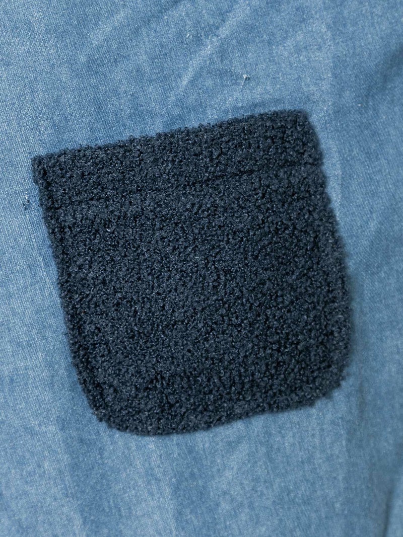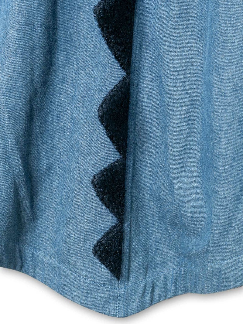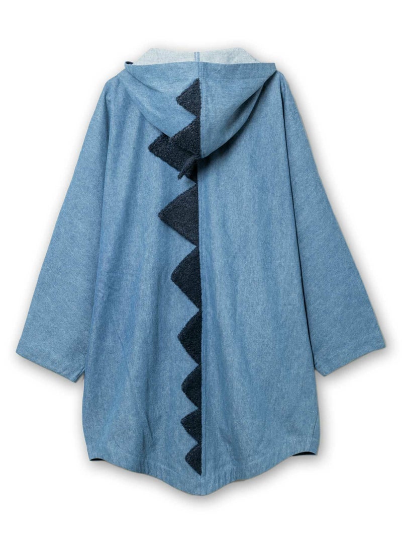 恐竜の特徴である「骨板」と呼ばれる背中のギザギザとポケット部分はボア素材で表現されたユニークな一着。