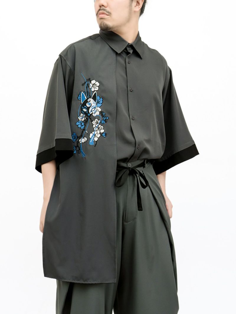 【雅結 -EN-】“狐面”総刺繍キモノスリーブ5分袖 変形シャツ